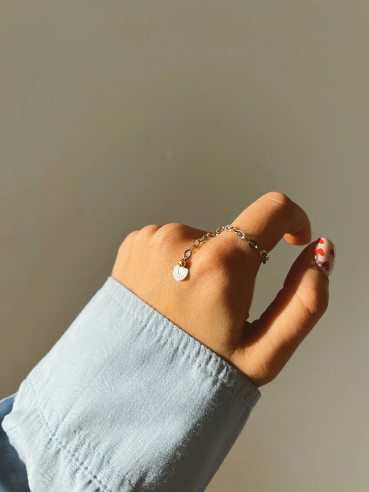 Идеальное кольцо для тех, кто любит носить украшения на разных пальцах. И можно больше не переживать о точности размера украшения для подарка! Кольцо дополнено небольшим медальоном и золотистым шаром. Чтобы надеть кольцо, просто застегните карабин. Длина изделия: 9,2 мм.