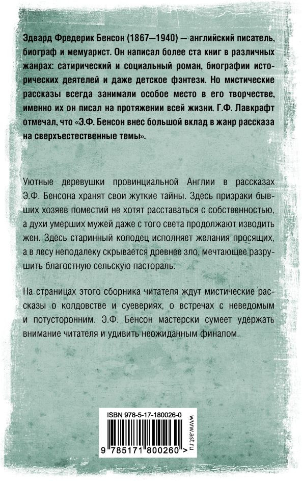 💳 Оплатить за товар можно при получении 🇰🇿 Есть бесплатная доставка по Казахстану 🎁 Копите бонусы с каждой покупки Серия: Вселенная Стивена Кинга Уютные деревушки провинциальной Англии в рассказах Э.Ф. Бенсона хранят свои жуткие тайны. Здесь призраки бывших хозяев поместий не хотят расставаться с собственностью, а духи умерших мужей даже с того света продолжают изводить жен. Здесь старинный колодец исполняет желания просящих, а в лесу неподалеку скрывается древнее зло, мечтающее разрушить благостную сельскую пастораль. На страницах этого сборника читателя ждут мистические рассказы о колдовстве и суевериях, о встречах с неведомым и потусторонним. Э.Ф. Бенсон мастерски сумеет удержать внимание читателя и удивить неожиданным финалом. |