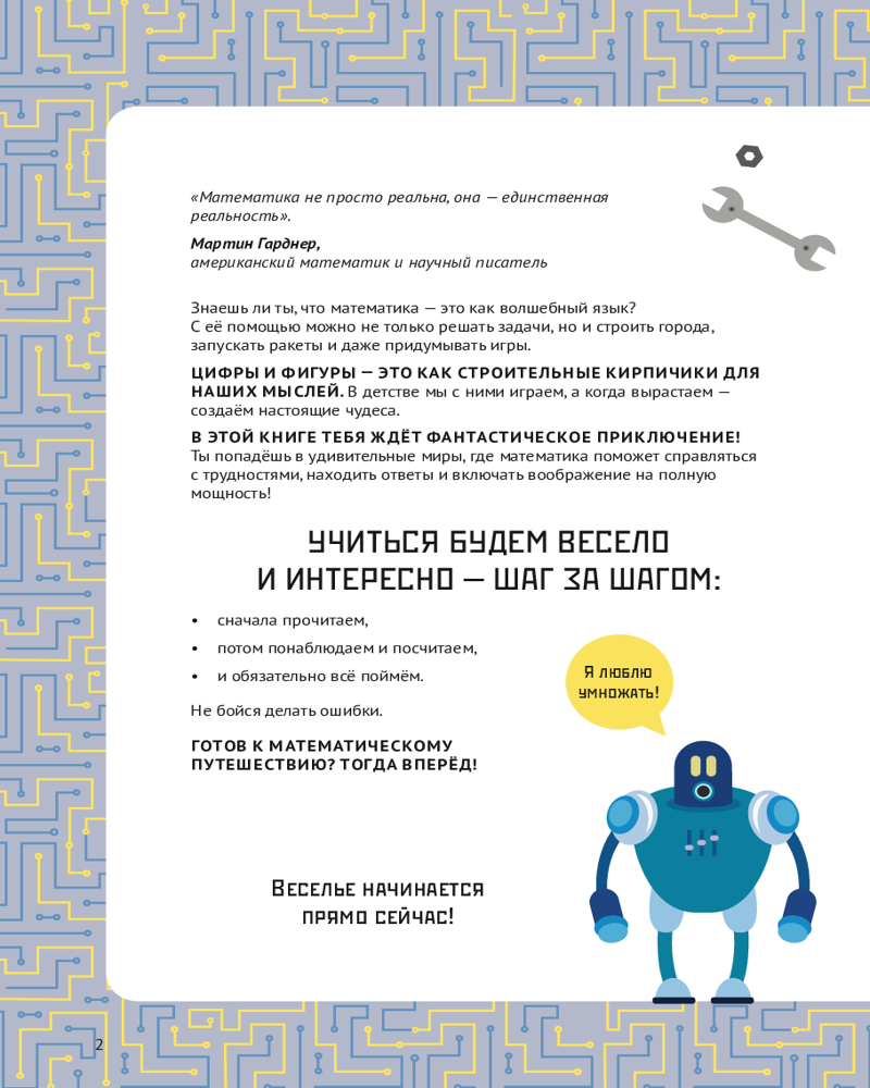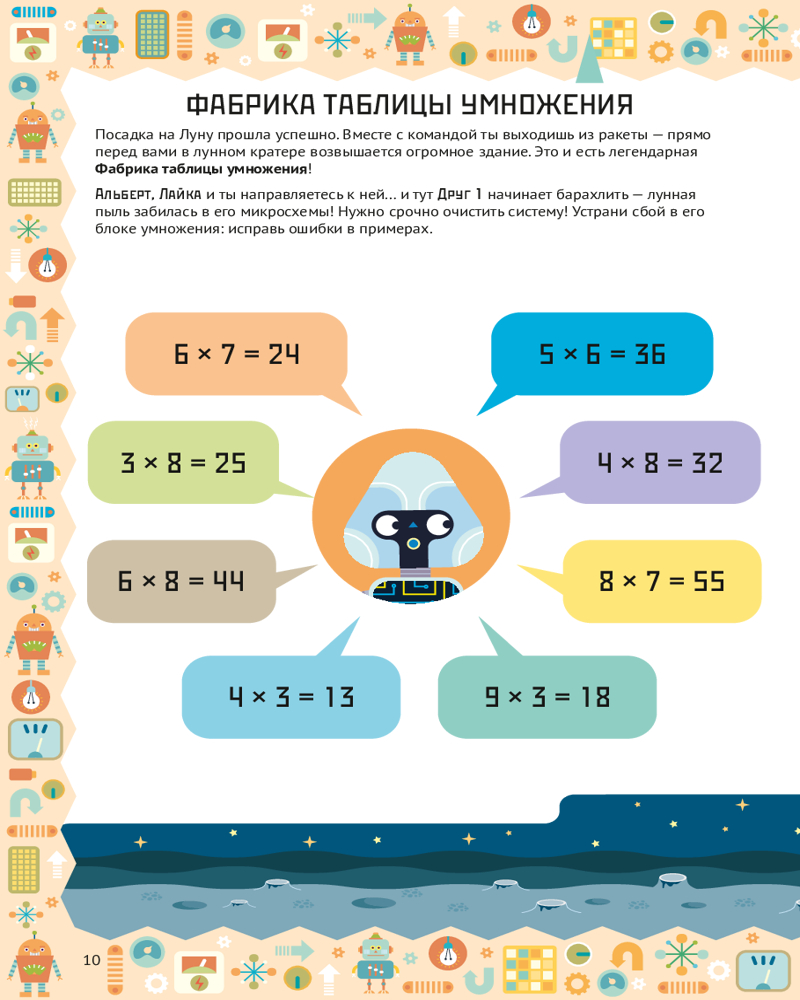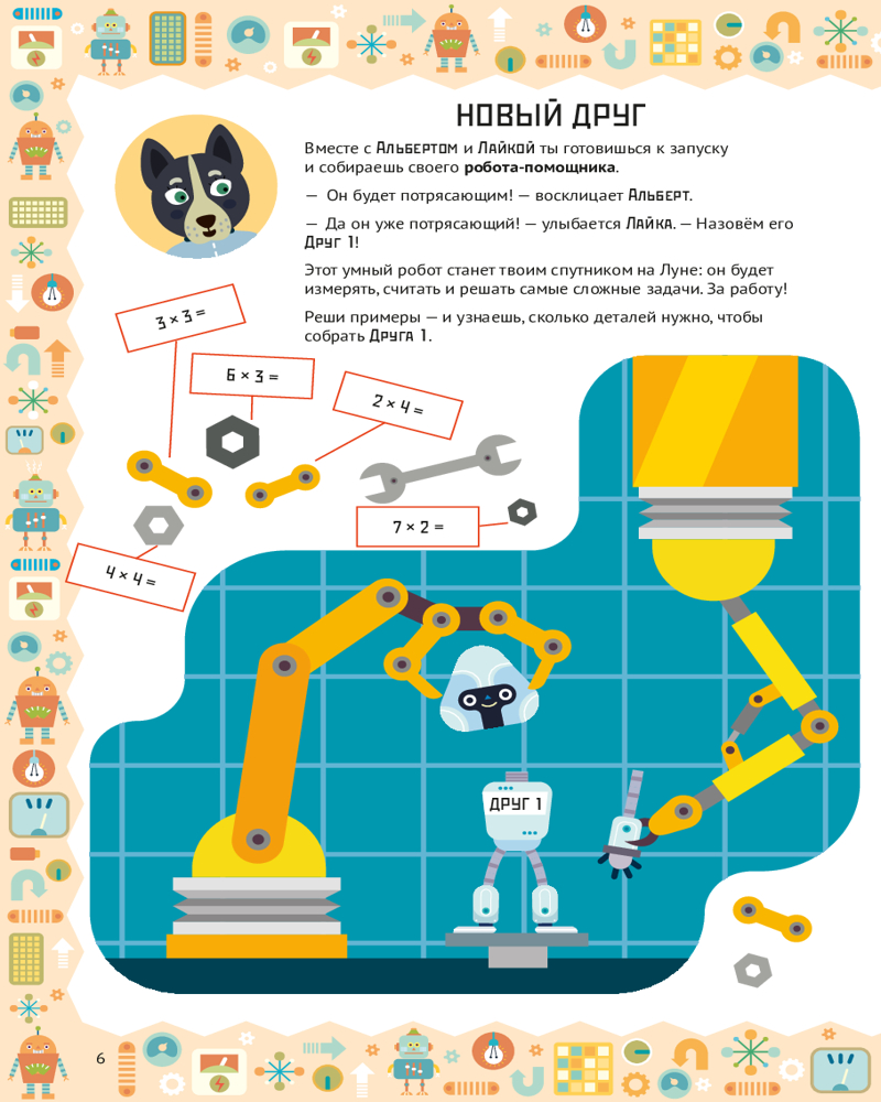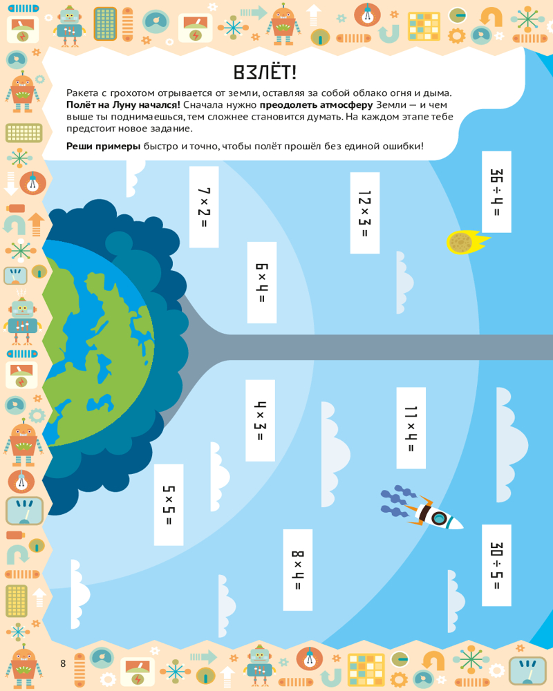 Серия: Математический старт Это тетрадь, которая поможет ребёнку от 8 лет без страха и скуки выучить таблицу умножения и научиться быстро делить. Вместе с героями — Альбертом, Лайкой и роботом-помощником Другом 1 — ребёнок отправится в космическое путешествие на фабрику вычислина, чтобы восстановить порядок и разгадать главную математическую тайну. Каждое упражнение построено так, чтобы ребёнок не просто запоминал, а понимал, как работает умножение и деление, и мог использовать эти знания в жизни. Книга развивает математическое мышление через задания-квесты, работу с наклейками и вовлекающие мини-истории. Отличный способ совместить обучение и удовольствие. |