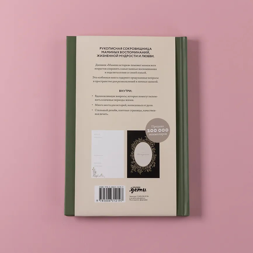 💳 Оплатить за товар можно при получении 🇰🇿 Есть бесплатная доставка по Казахстану 🎁 Копите бонусы с каждой покупки Дневник «Мамина история» поможет мамам всех возрастов сохранить самые важные воспоминания и поделиться ими со своей семьей. Эта особенная книга содержит продуманные вопросы и пространство для размышлений и личных записей. Настоящая рукописная сокровищница маминых воспоминаний, жизненной мудрости и любви. Размер дневника: 23.4×15.9×1.2 см. |