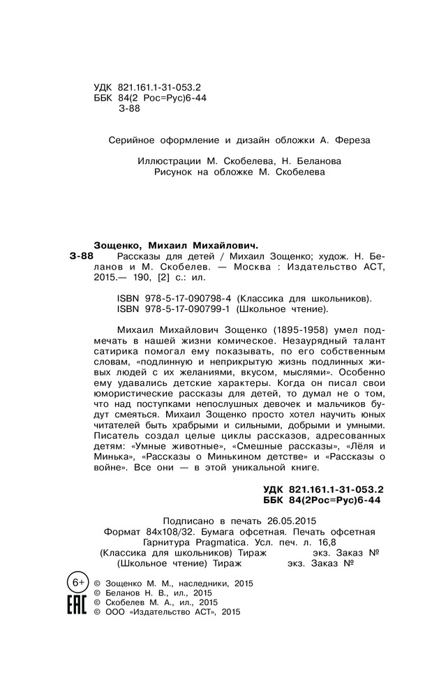 В данный момент этот товар отсутствует в продаже. Возможно, у нас найдется аналогичный или похожий товар здесь. Серия: Школьное чтение Зощенко Михаил Михайлович (1894–1958) — замечательный русский писатель-сатирик, классик русской литературы. Рассказы М. Зощенко для детей великолепно передают атмосферу детства. Многие рассказы автобиографичны. На своём примере писатель показывает, чем оборачивается обман и малодушие. Писатель М. Зощенко учит детей быть храбрыми и честными, поступать по совести. Каждый рассказ — это простой и ненавязчивый урок нравственности, который, благодаря мастерству и искренности писателя, надолго западает в детскую душу.