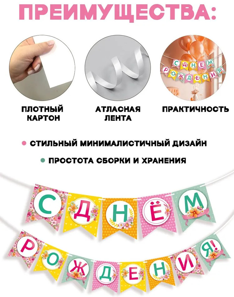 Гирлянда «С днем рождения!»В данный момент этот товар отсутствует в продаже. Возможно, у нас найдется аналогичный или похожий товар здесь. Красочная гирлянда — настоящая находка для праздника, будь то весёлый день рождения, радостный юбилей или трогательное поздравление в кругу семьи. Яркие флажки, украшенные цветочными мотивами и стильной графикой, формируют выразительную надпись «С днём рождения!». Сделанная из прочного картона, декоративная гирлянда состоит из 11 элементов размером 13.8×11.4 см. Её общая длина — 2 метра, что позволяет повесить её на стену, на дверь или в фотозоне. В комплект входит атласная лента, с помощью которой флажки легко нанизываются в нужной последовательности. Гирлянда легко собирается и также просто складывается для компактного хранения до следующего праздника. Бумажная растяжка станет эффектным украшением для любого помещения: детский сад, школа, квартира. |