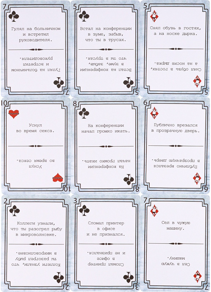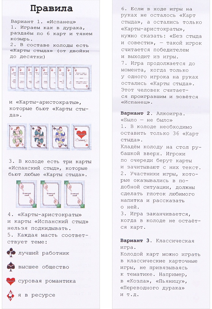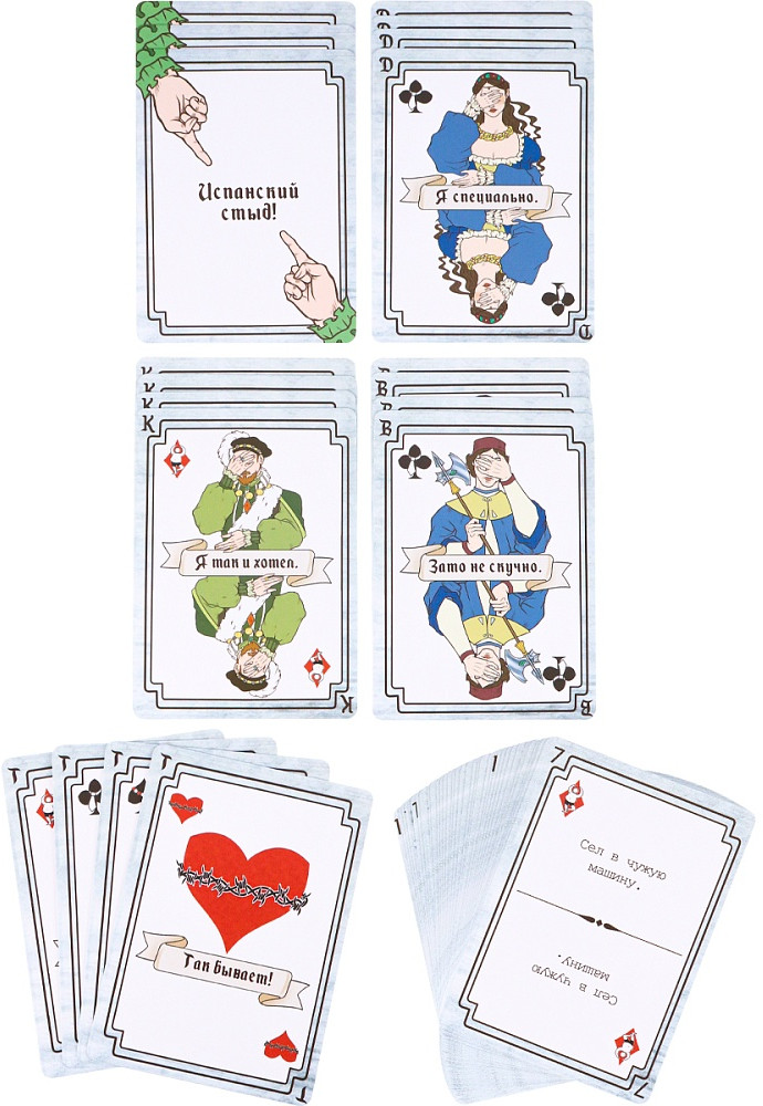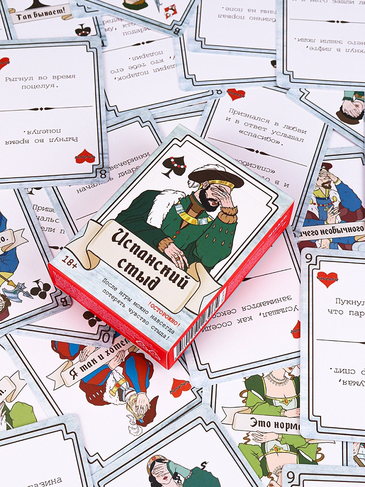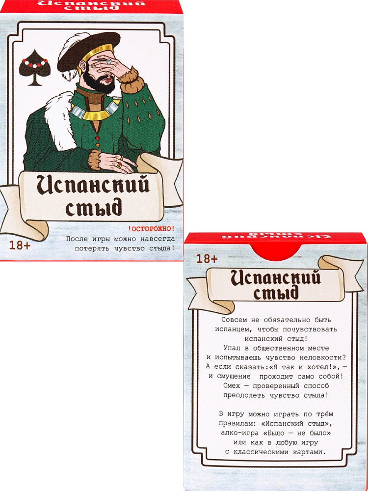 Совсем не обязательно быть испанцем, чтобы почувствовать «испанский стыд»! Упал в общественном месте и испытываешь чувство неловкости? А если сказать: «Я так и хотел!» — и смущение проходит само собой! Смех — проверенный способ преодолеть чувство стыда! В игру можно играть по трем правилам: «Испанский стыд», алко-игра «Было-не было» или в любую игру с классическими картами. |