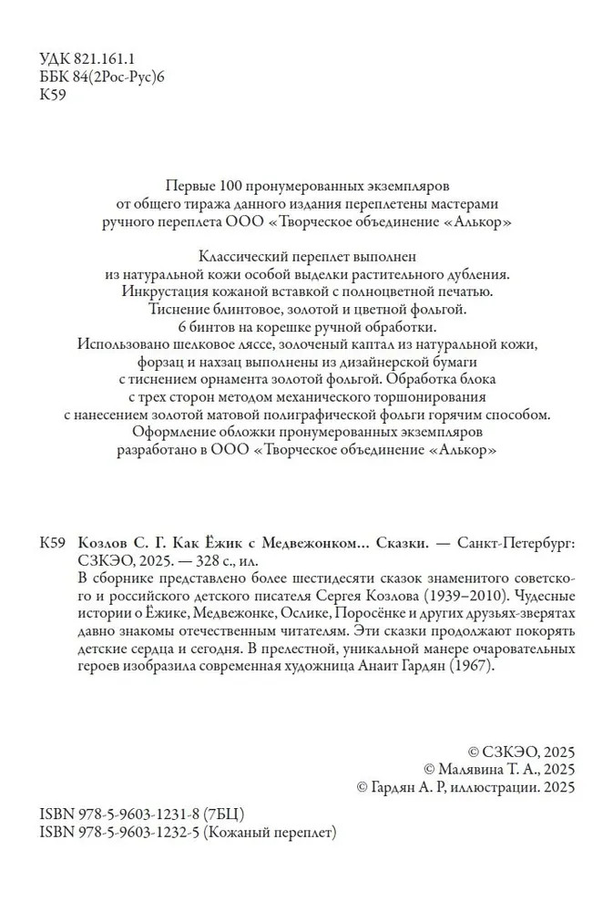 💳 Оплатить за товар можно при получении 🇰🇿 Есть бесплатная доставка по Казахстану от 1 дня 🎁 Копите бонусы с каждой покупки Серия: Библиотека мировой литературы Сказки Сергея Козлова, представленные в данном сборнике, рассказывают читателям об умении доверять, о страхе, любви и одиночестве. Ёжик, Медвежонок, Заяц, Белка и многие другие зверята вместе играют, ходят в гости, наблюдают за окружающим миром и ведут беседы. Ненавязчивым образом их рассуждения начинают касаться и вечных тем. Трогательные маленькие герои предстают в исполнении талантливой художницы Анаит Р. Гардян (1967). Анаит родилась в Ереване и училась в Армянском педагогическом институте. Поначалу художница работала мультипликатором на киностудии «Арменфильм», а позднее заинтересовалась книжной иллюстрацией. Анаит сотрудничает со многими издательствами, оформляет книжные обложки и иллюстрирует произведения детских писателей. На сегодняшний день работы Анаит Гардян украшают не менее тридцати книг. |