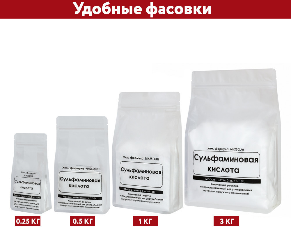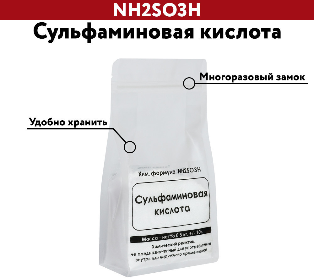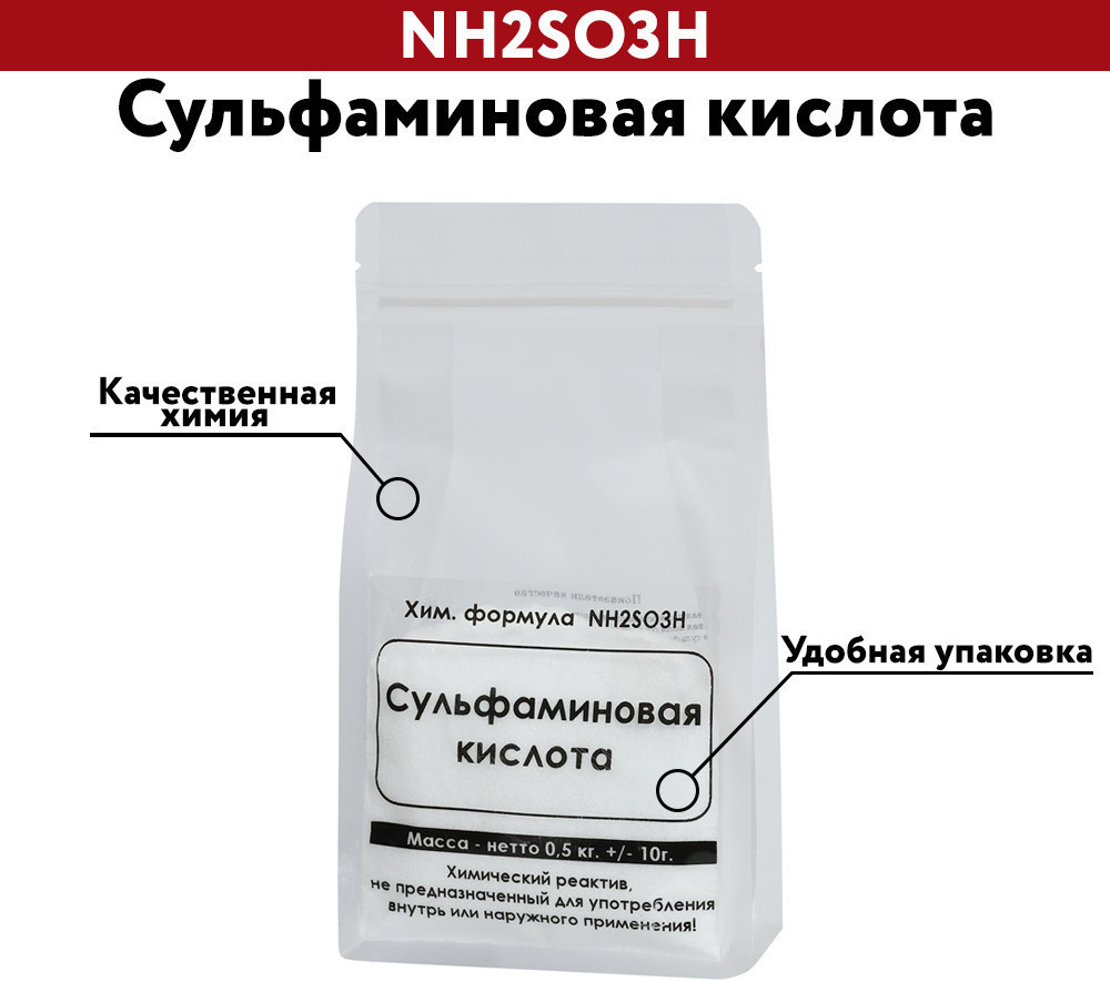 Сульфаминовая кислота NH2SO3H — это белое кристаллическое вещество без запаха, хорошо растворяющееся в воде. Химическая формула: NH₂SO₃H. Безопасна при правильном обращении, но требует защиты кожи и глаз, так как является кислотой. Качественная химия в удобной упаковке с многоразовым замком. |