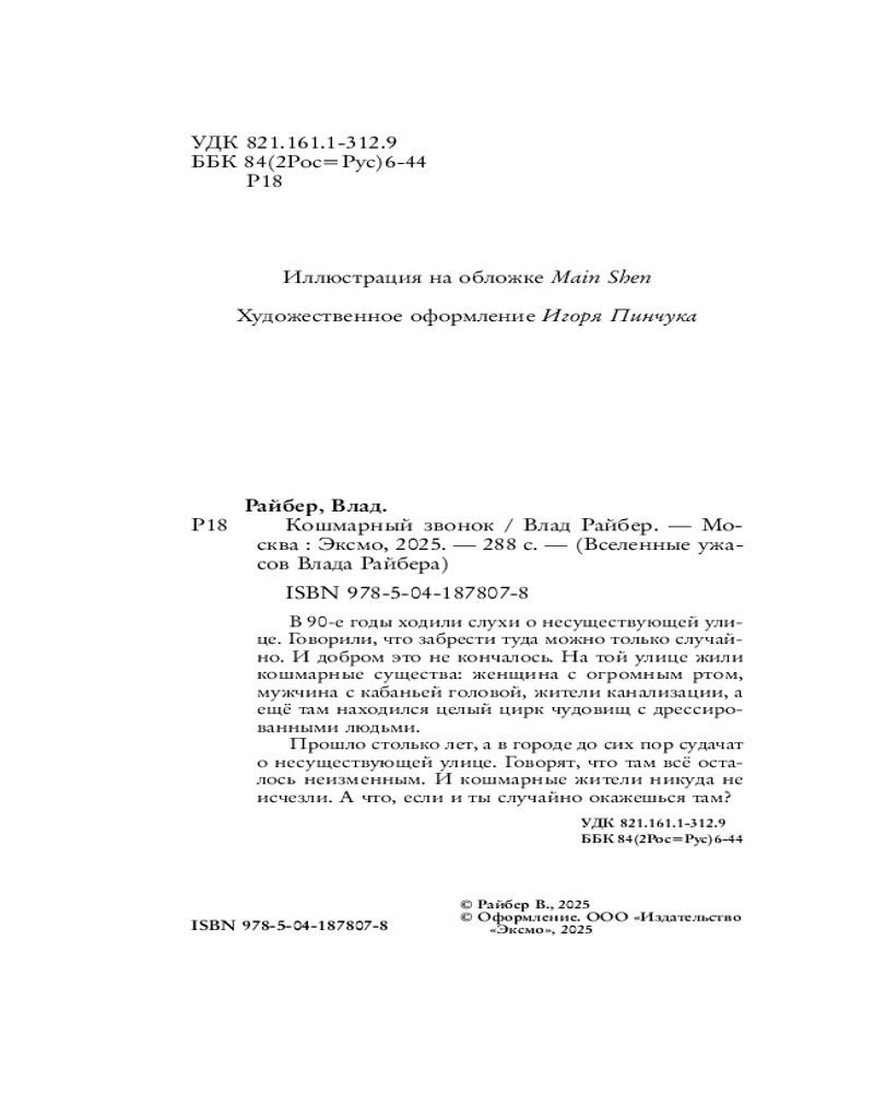 Серия: Вселенные ужасов Влада Райбера Новинка финалиста премии «Эксмо.Дебют» Влада Райбера, мастера страшных рассказов, мгновенно ставших бестселлерами. Его истории придутся по вкусу поклонникам «Зайчика», «Закулисья» и других хоррор-стори. В этой книге вас ждёт путешествие в прошлое. В жуткие и таинственные 90-е годы, когда кошмарные сны становились реальностью. Вы узнаете, каких чудовищ боялись подростки тогда и каких боятся сейчас.
