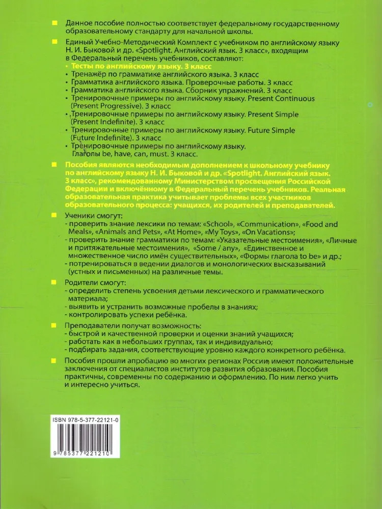 💳 Оплатить за товар можно при получении 🇰🇿 Есть бесплатная доставка по Казахстану от 1 дня 🎁 Копите бонусы с каждой покупки Серия: Учебно-методический комплект. Начальная школа Настоящее пособие полностью соответствует федеральному государственному образовательному стандарту для начальной школы. Тесты составлены на основе программы учебника «Прожектор. Английский язык» для 3-го класса. В пособие включены задания по восьми основным модулям учебника. Тесты представлены в двух вариантах, аналогичных по сложности, и могут использоваться как на самостоятельном уроке, так и в качестве работы дома. |