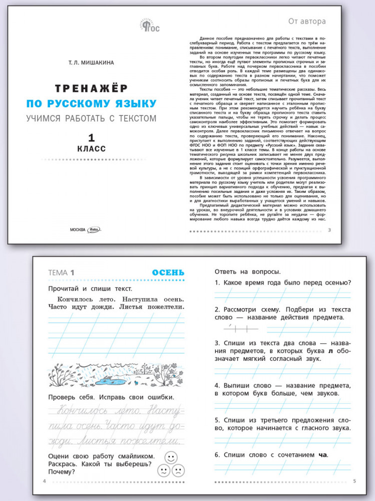 💳 Оплатить за товар можно при получении 🇰🇿 Есть бесплатная доставка по Казахстану 🎁 Копите бонусы с каждой покупки Серия: Тренажёр Пособие составлено в соответствии с требованиями действующего ФГОС начального общего образования и позволяет выработать у учащихся 1 класса навыки работы с текстом: чтение, понимание прочитанного и списывание текста в тетрадь, а также навыки выполнения заданий, составленных в соответствии с основными разделами учебной программы по русскому языку. Предназначается учителям начальных классов, учащимся и их родителям. |