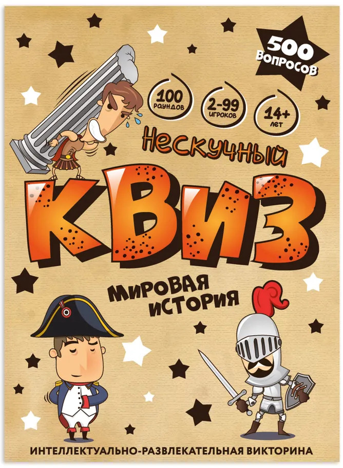 💳 Оплатить за товар можно при получении 🇰🇿 Есть бесплатная доставка по Казахстану 🎁 Копите бонусы с каждой покупки Нескучный квиз «Мировая история» — увлекательная игра-викторина для настоящих любителей исторических открытий! Вас ждут 500 тщательно подобранных вопросов о ключевых событиях, выдающихся личностях и захватывающих фактах из разных уголков мира. Наш квиз отлично подходит для корпоративных вечеринок, встреч с друзьями и семейных посиделок — это отличный способ весело провести время, расширить кругозор, проверить свою память и протестировать эрудицию! Готовы проверить свои знания и стать настоящим знатоком мировой истории? Тогда Нескучный квиз уже ждёт вас! |