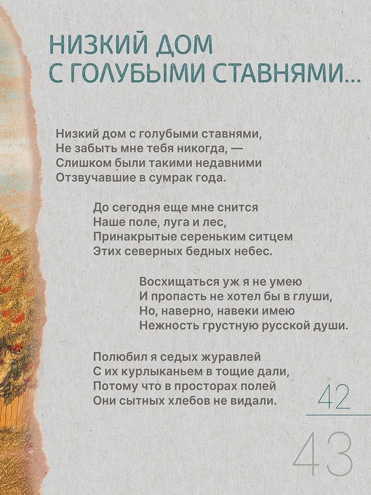 Серия: Палитра В иллюстрации Карины Милосердовой влюбляешься с первого взгляда. Они не просто дополнение текста, а искренний, проникновенный диалог с поэзией. Тонкие, наполненные светом и воздухом пейзажи, трогательные образы деревень и городов оживают на страницах, заставляя строки Есенина дышать по-новому. Сборник предлагает уникальное путешествие по ключевым для поэта местам и темам. Читатель пройдет от тихой красоты родного автору Константинова к шумным, контрастным улицам Москвы и загадочным проспектам Санкт-Петербурга, а завершат этот путь стихотворения, посвященные необъятным просторам Родины. |