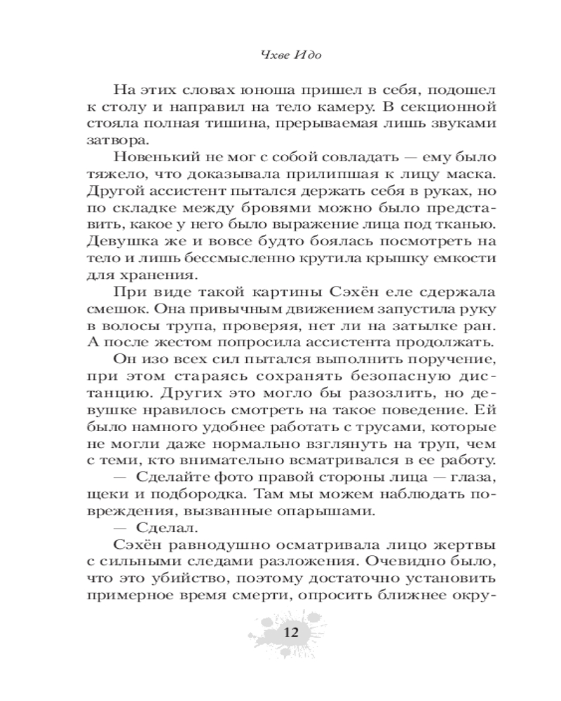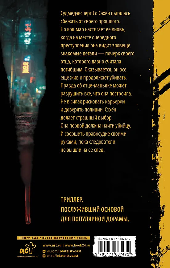 💳 Оплатить за товар можно при получении 🇰🇿 Есть бесплатная доставка по Казахстану 🎁 Копите бонусы с каждой покупки Серия: Тени Азии Судмедэксперт Со Сэхён пыталась сбежать от своего прошлого. Но кошмар настигает ее вновь, когда на месте очередного преступления она видит зловеще знакомые детали — почерк своего отца, которого давно считала погибшим. Оказывается, он все еще жив и продолжает убивать. Правда об отце-маньяке может разрушить все, что она построила. Не в силах рисковать карьерой и доверять полиции, Сэхён делает страшный выбор. Она первой должна найти убийцу. И вершить правосудие своими руками, пока следователи не вышли на ее след. |