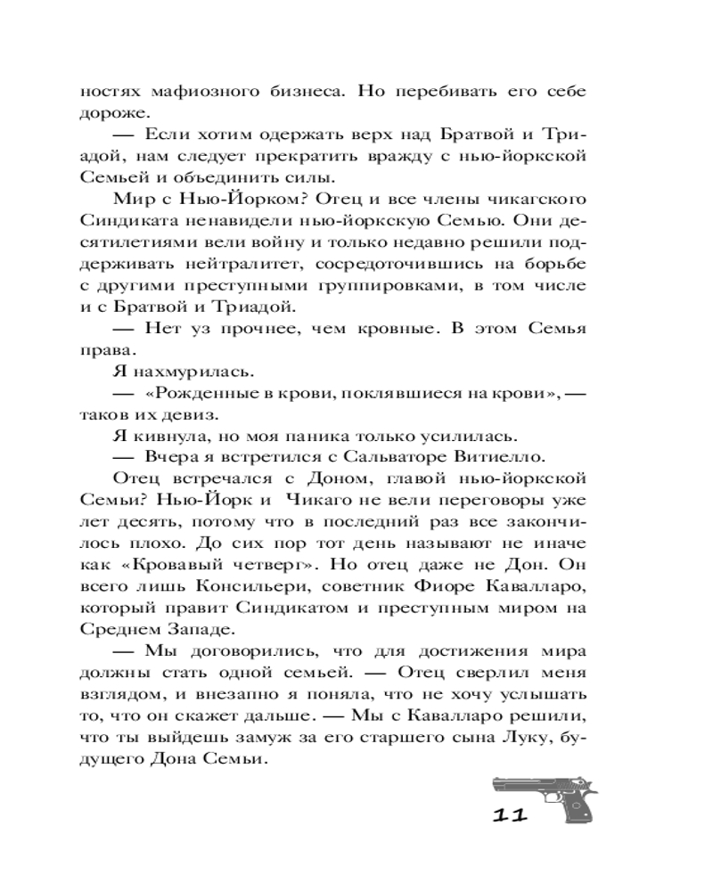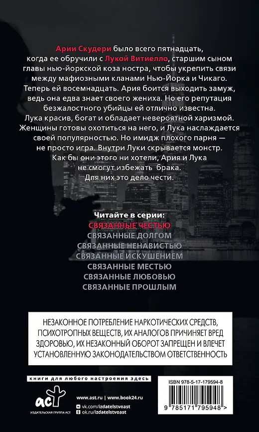 💳 Оплатить за товар можно при получении 🇰🇿 Есть бесплатная доставка по Казахстану 🎁 Копите бонусы с каждой покупки Серия: Любовь и мафия. Бестселлеры Коры Рейли Арии Скудери было всего пятнадцать, когда ее обручили с Лукой Витиелло, старшим сыном главы нью-йоркской Коза Ностры, чтобы укрепить связи между мафиозными кланами Нью-Йорка и Чикаго. Теперь ей восемнадцать. Ария боится выходить замуж, ведь она едва знает своего жениха. Но его репутация безжалостного убийцы ей отлично известна. Лука красив, богат и обладает невероятной харизмой. Женщины готовы охотиться на него, и Лука наслаждается своей популярностью. Но имидж плохого парня — не просто игра. Внутри Луки скрывается монстр. Как бы они этого ни хотели, Ария и Лука не смогут избежать брака. Для них это дело чести. |