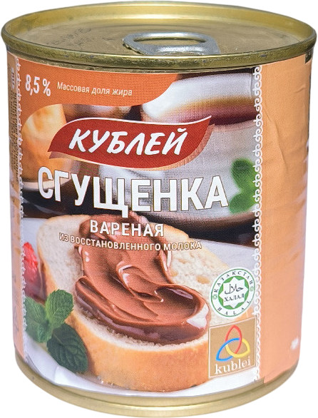 Вареная сгущенка «Кублей» — это продукт из восстановленного молока с жирностью 8,5%, изготовленный путем термической обработки сгущенного с сахаром молока. Она имеет характерный коричневый цвет, густую, однородную и тягучую консистенцию. |