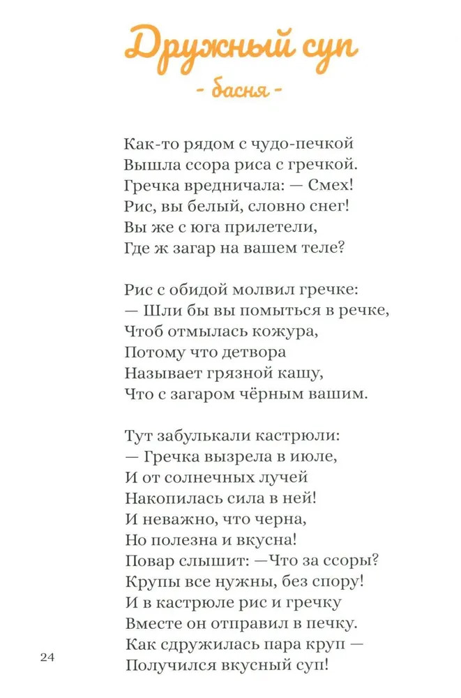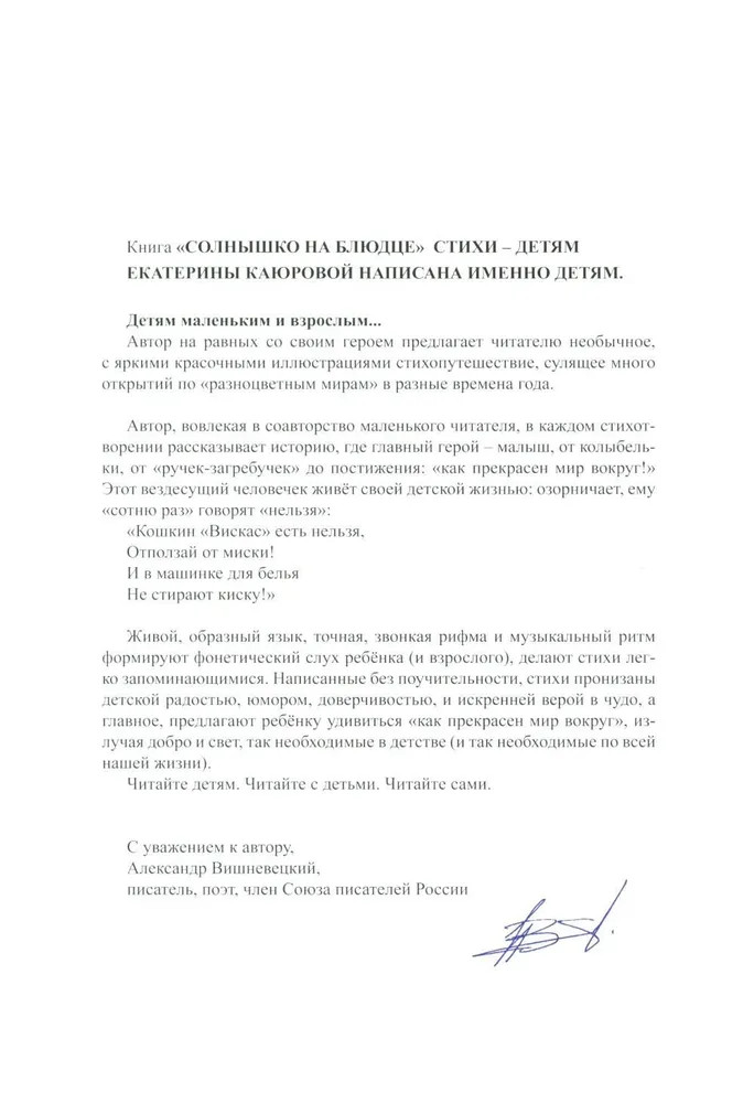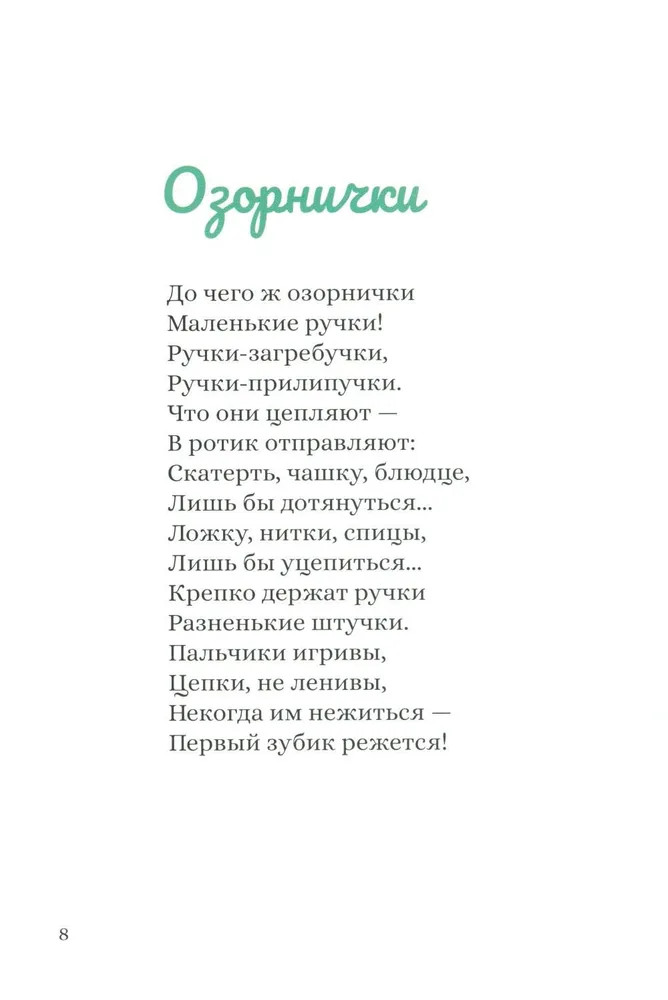 Это третья книга стихов для детей Екатерины Каюровой. Путёвку в страну детской поэзии ей «выписал» на семинаре в 2002 году известный отечественный поэт Олег Николаевич Шестинский добрым советом: «писать стихи для детей и найти хороших рисовальщиков». «Солнышко на блюдце» — приглашение в страну детства как будущих взрослых, так и бывших детей. Ведь в каждом из нас живёт ребёнок — так возьмите его за ручку и вместе с детьми окунитесь в счастливое босоногое детство и, конечно, подружитесь с героем книги, этим вездесущим карапузом, буквально «списанным» с собственных детей как автором, так и художницами Еленой Писаренко и Марией Надоровой. Стихи в книге расположены по временам года: звонкие, как весенние ручейки, тёплые, как лучики солнца, яркие, как осенние листья, весёлые, как новогодние праздники, к тому же понятные, ласковые, напевные, лёгкие для запоминания, привносящие в мир ребёнка заряд добра, красоты и света. |