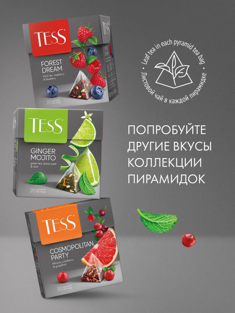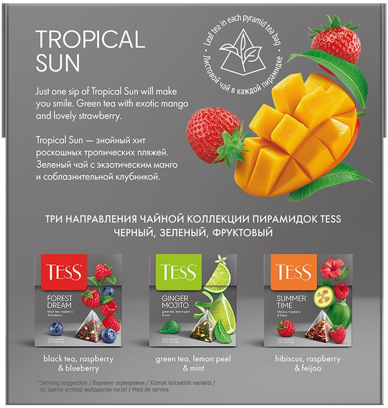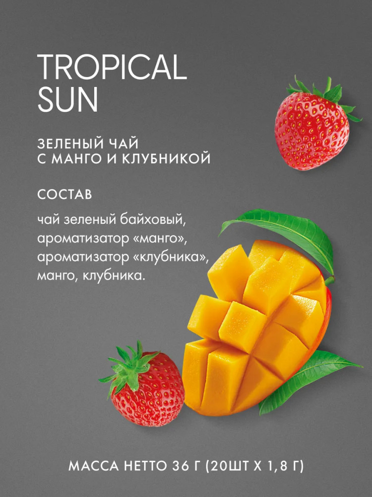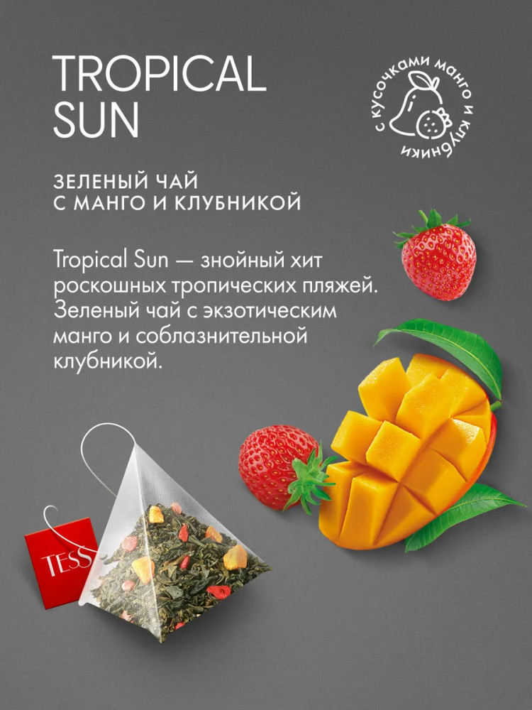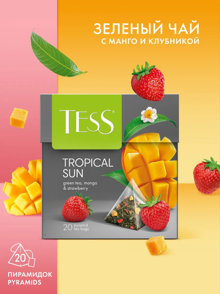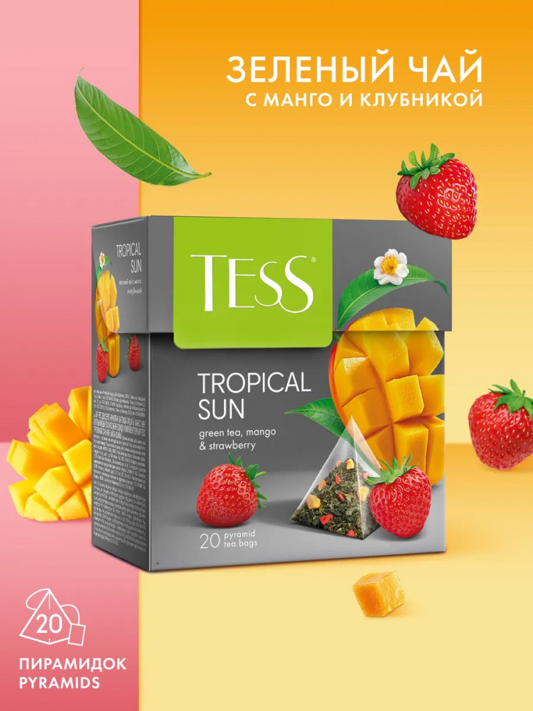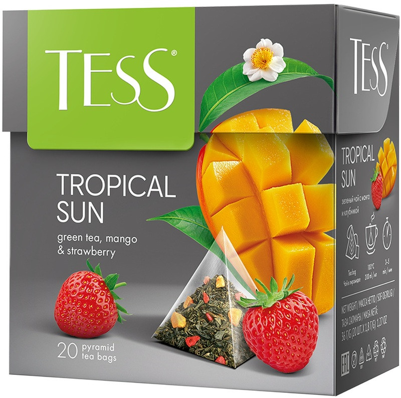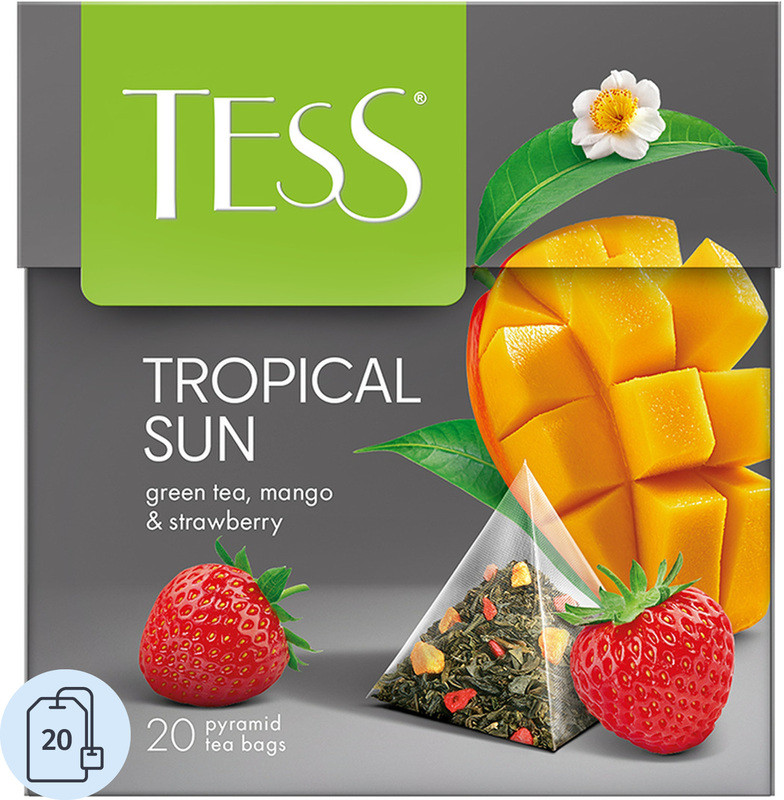 Каждая пирамидка позволяет чаю максимально раскрыть свой букет, сохраняя все полезные свойства зелёного чая. Удобная форма упаковки предотвращает потерю аромата и вкусовых качеств продукта, обеспечивая наилучший результат при заваривании. Чай в пирамидках Tess Tropical Sun идеально подходит для быстрого и удобного приготовления, будь то дома, в офисе или в путешествии. Всё, что вам нужно, — это чашка горячей воды и пара минут свободного времени, чтобы насладиться исключительным вкусом и ароматом этого замечательного зелёного чая.