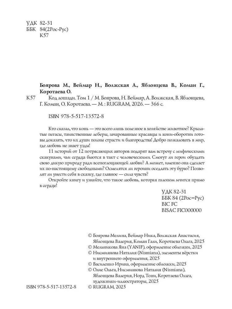 💳 Оплатить за товар можно при получении 🇰🇿 Есть бесплатная доставка по Казахстану от 1 дня 🎁 Копите бонусы с каждой покупки Кто сказал, что конь — это всего лишь полезное в хозяйстве животное? Крылатые пегасы, таинственные леберы, зачарованные красавцы и кони-оборотни готовы доказать, что их души полны страсти и благородства! Добро пожаловать в мир, где любовь не знает узды!11 историй от 12 потрясающих авторов подарят вам встречу с мифическими скакунами, чьи сердца бьются в такт с человеческими. Смогут ли герои обуздать свою дикую природу ради всепоглощающей любви? А может, именно она сделает их по-настоящему свободными? Осмелятся ли героини оседлать эту бурю? Позволят ли унести себя в сказку, где главное — сила чувств? Откройте книгу и узнайте, что такое любовь, которая галопом мчится прямо в сердце! |