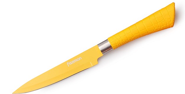Очень удобная и эргономичная ручка не позволит выскользнуть ножу из Вашей руки. Нож с широким клинком и с центрированным острием позволит резать продукты без труда. Нержавеющая сталь с цветным покрытием.