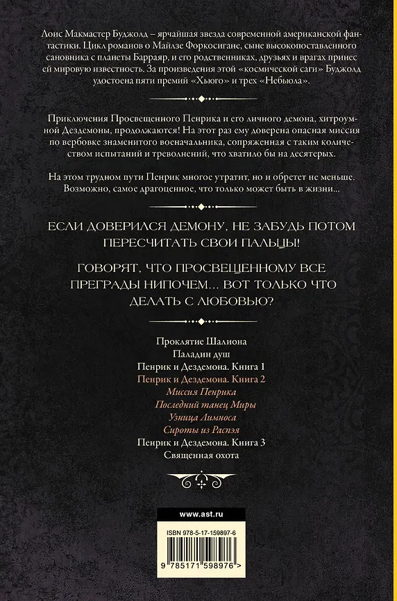 💳 Оплатить за товар можно при получении 🇰🇿 Есть бесплатная доставка по Казахстану от 1 дня 🎁 Копите бонусы с каждой покупки Серия: Хроники Шалиона Приключения Просвещенного Пенрика и его личного демона, хитроумной Дездемоны, продолжаются! На этот раз ему доверена опасная миссия по вербовке знаменитого военачальника, сопряженная с таким количеством испытаний и треволнений, что хватило бы на десятерых. На этом трудном пути Пенрик многое утратит, но и обретет не меньше. Возможно, самое драгоценное, что только может быть в жизни... |