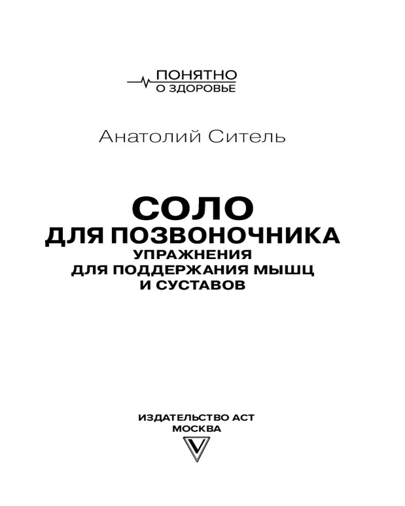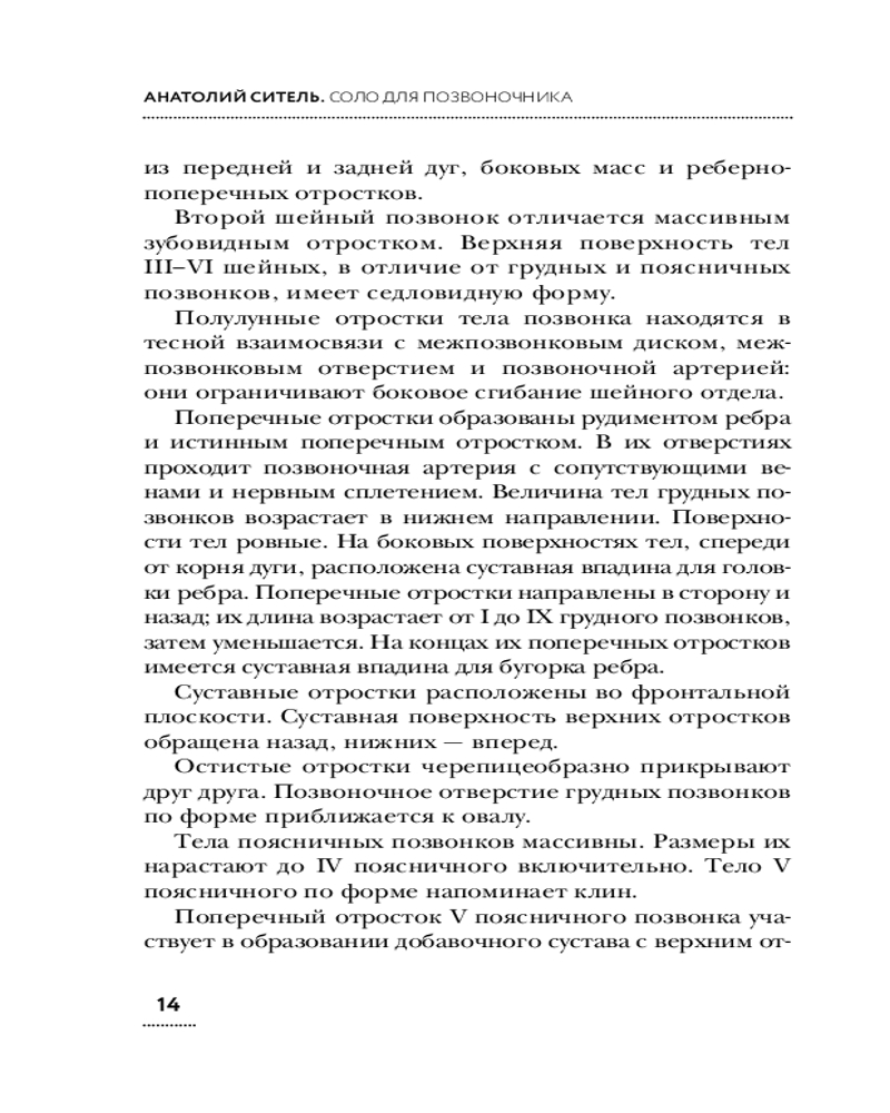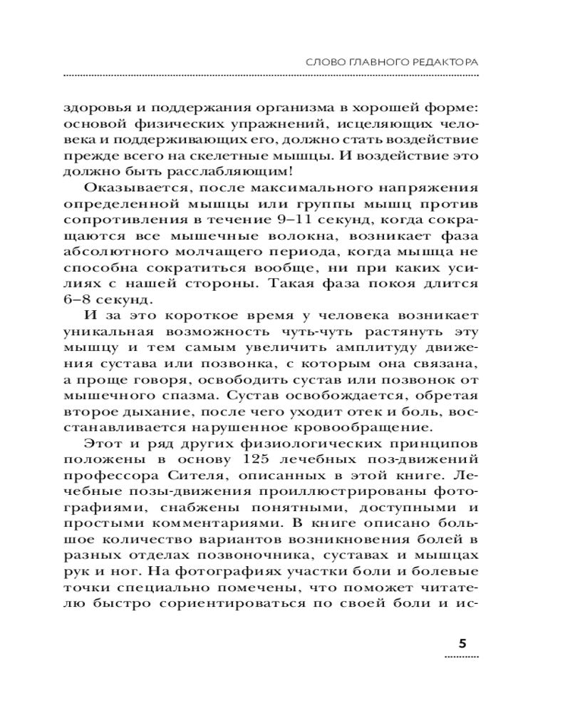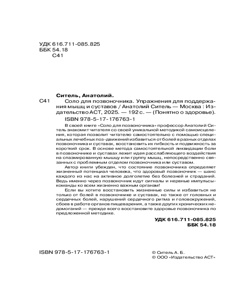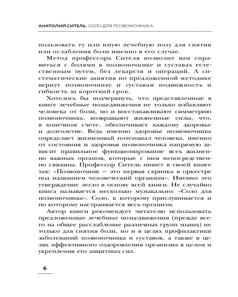 💳 Оплатить за товар можно при получении 🇰🇿 Есть бесплатная доставка по Казахстану от 1 дня 🎁 Копите бонусы с каждой покупки Серия: Упражнения для жизни В своей книге «Соло для позвоночника» профессор Анатолий Ситель знакомит читателя со своей уникальной методикой самоисцеления, которая позволит читателю самостоятельно с помощью специальных лечебных поз-движений избавиться от болей в разных отделах позвоночника и суставах, восстановить их гибкость и подвижность за короткий срок. В основе метода самостоятельной ликвидации боли в позвоночнике и суставах лежит идея расслабляющего воздействия на спазмированную мышцу или группу мышц, непосредственно связанных с проблемным отделом позвоночника или суставом. |