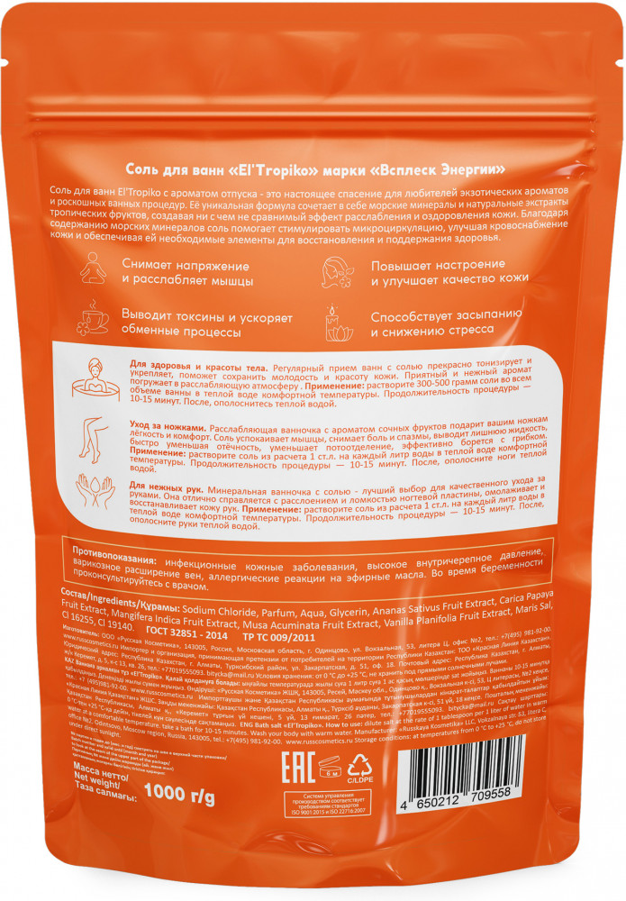 Всплеск энергии Соль для ванн «El` Tropiko. Манго, ананас, папайя»