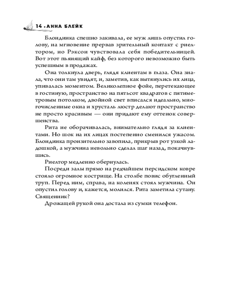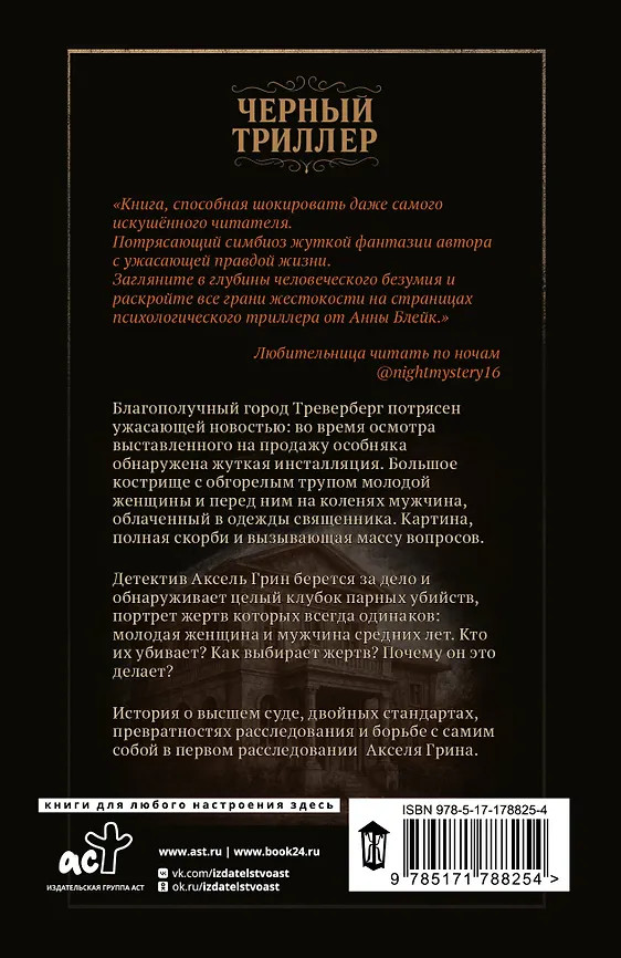 За грехи отцовВ данный момент этот товар отсутствует в продаже. Возможно, у нас найдется аналогичный или похожий товар здесь. Серия: Черный триллер от Анны Блейк Благополучный город Треверберг потрясен ужасающей новостью: во время осмотра выставленного на продажу особняка обнаружена жуткая инсталляция. Большое кострище с обгорелым трупом молодой женщины и перед ним на коленях мужчина, облаченный в одежды священника. Картина, полная скорби и вызывающая массу вопросов. Детектив Аксель Грин берется за дело и обнаруживает целый клубок парных убийств, портрет жертв которых всегда одинаков: молодая женщина и мужчина средних лет. Кто их убивает? Как выбирает жертв? Почему он это делает? |