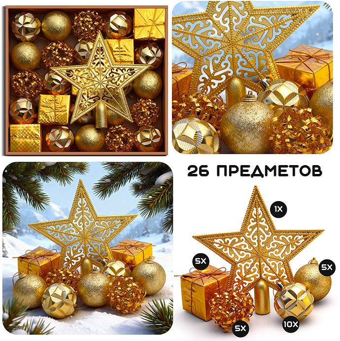 Набор новогодних украшений — это волшебное сочетание блеска, уюта и праздничного настроения! Каждый элемент создан, чтобы превратить ёлку в настоящее произведение искусства. Игрушки гармонично сочетаются между собой по цвету и форме, создавая завершённый, стильный образ. Такой набор станет идеальным выбором для тех, кто ценит эстетику, традиции и хочет наполнить дом атмосферой тепла и новогоднего чуда. |