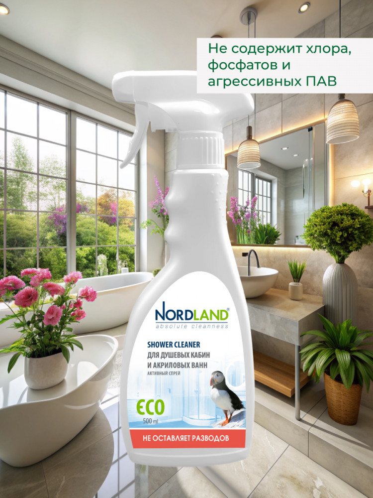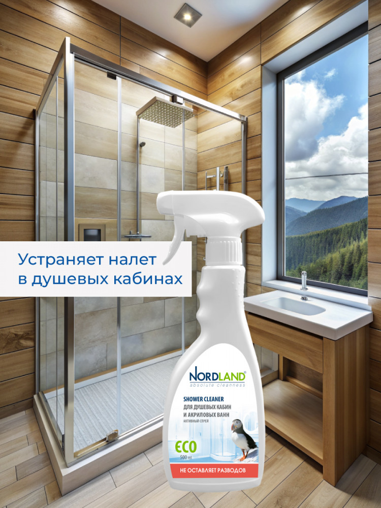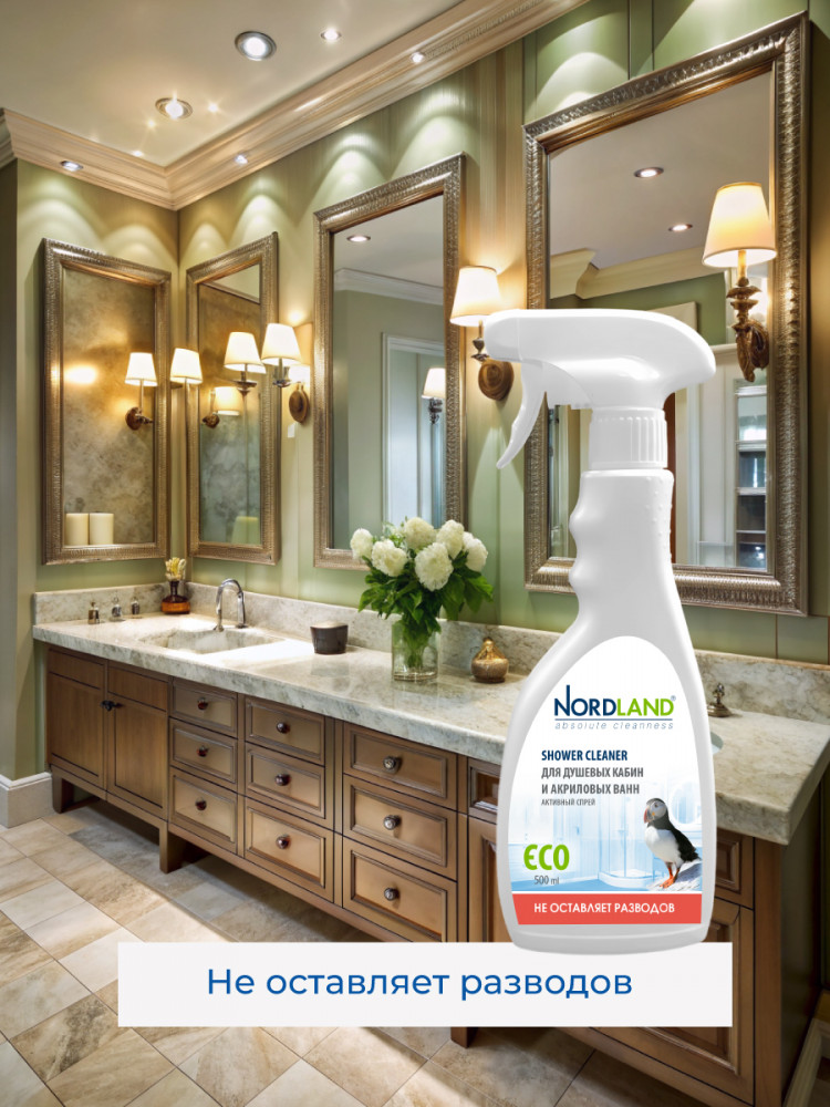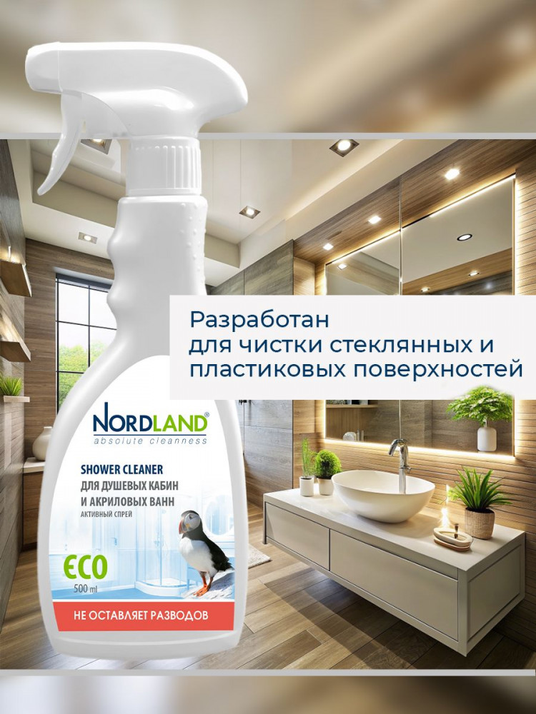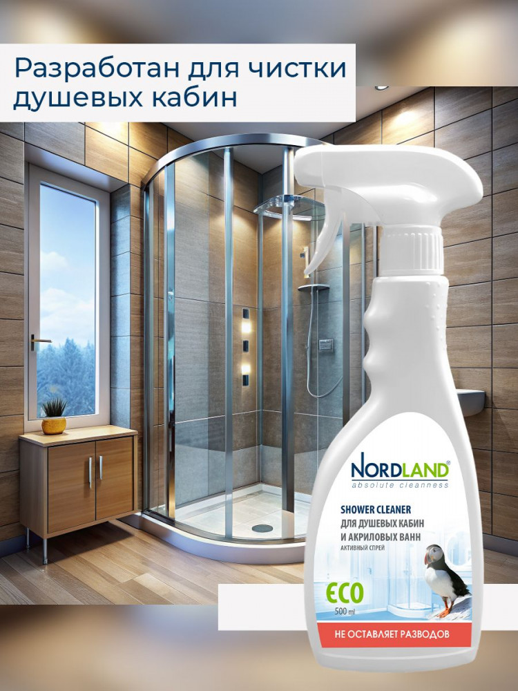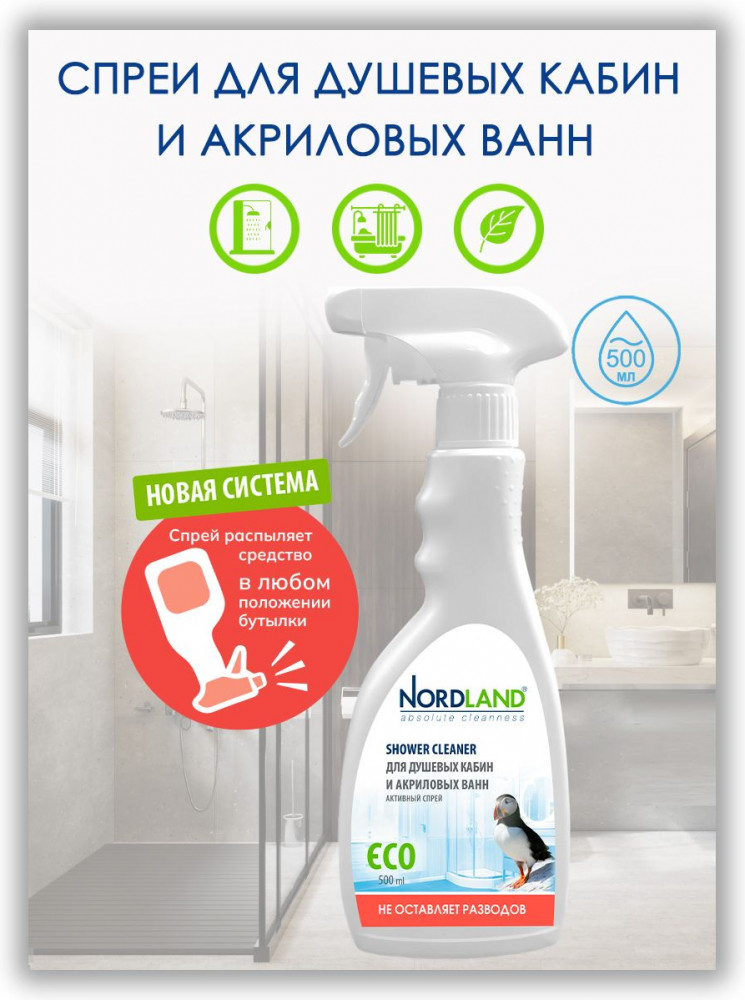 Активный спрей для душевых кабин и акриловых ванн Nordland. Разработан для чистки душевых кабин, стеклянных и пластиковых поверхностей. Удаляет налет от жесткой воды, остатки мыла, органические загрязнения. Препятствует образованию и развитию плесени. Не содержит хлора, фосфатов и агрессивных ПАВ. Содержит в составе молочную кислоту и ПАВ на растительной основе. Средство не оставляет разводов, устраняет налет в душевых кабинах, безопасно для акриловых ванн, подходит для септиков. Новая система спрея позволяет распылять средство в любом положении, в прямом или в перевернутом. Благодаря этому средство можно использовать даже в самых труднодоступных местах.