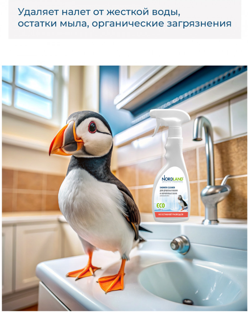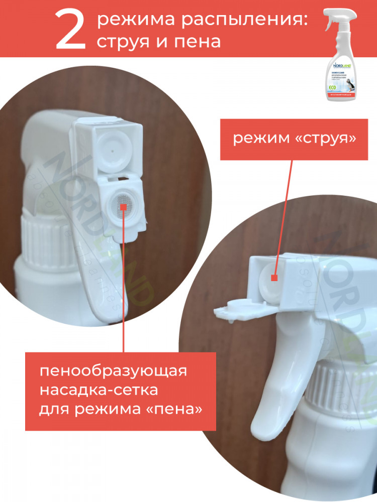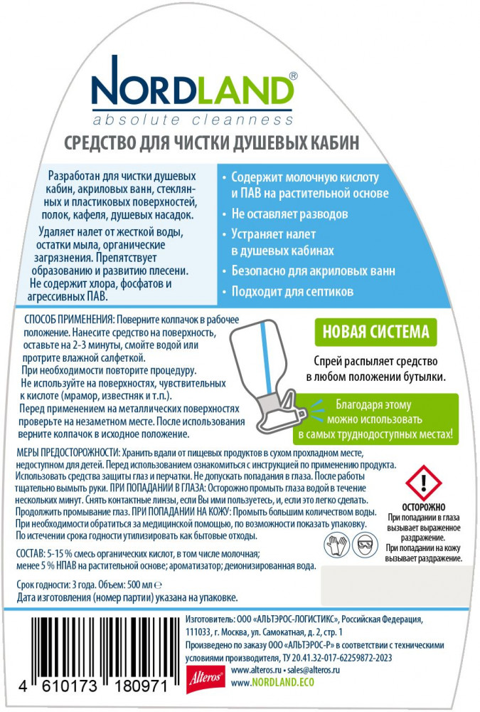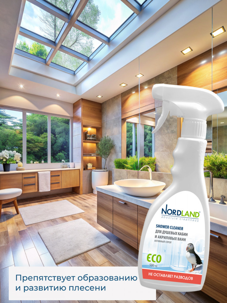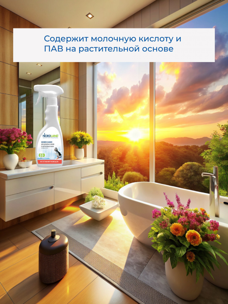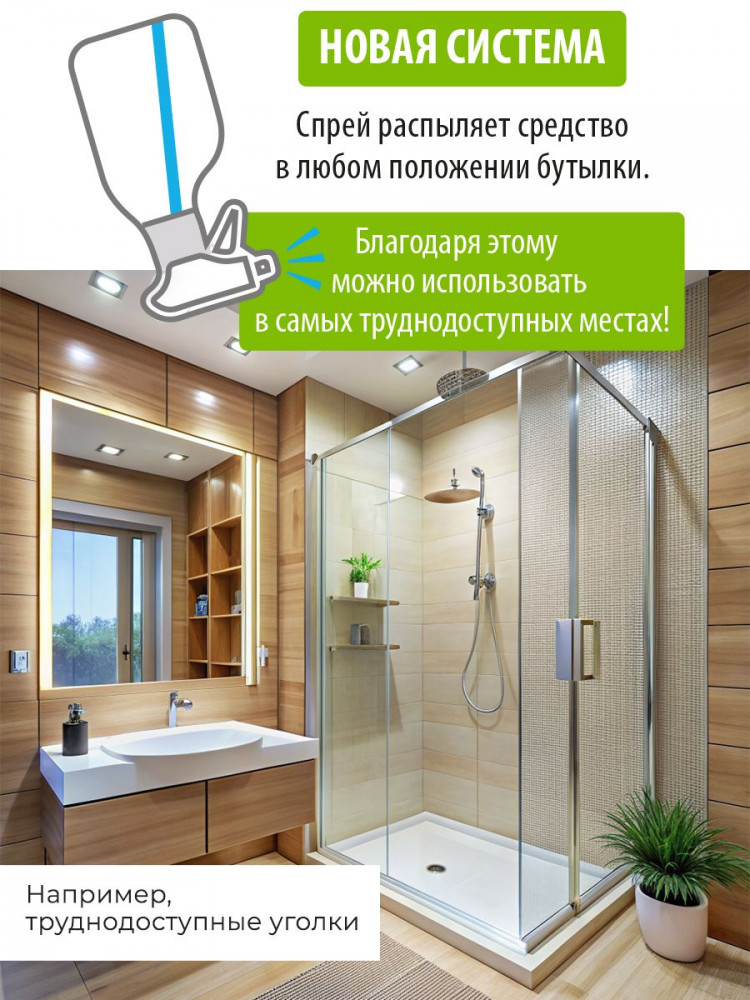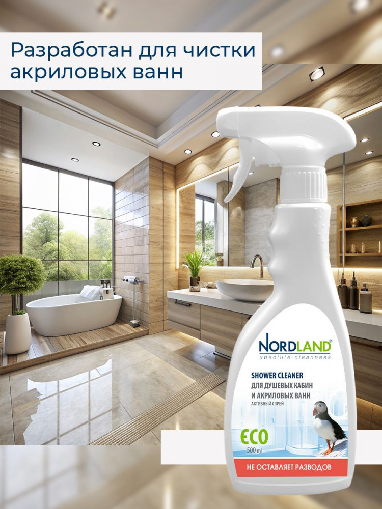 Активный спрей для душевых кабин и акриловых ванн Nordland. Разработан для чистки душевых кабин, стеклянных и пластиковых поверхностей. Удаляет налет от жесткой воды, остатки мыла, органические загрязнения. Препятствует образованию и развитию плесени. Не содержит хлора, фосфатов и агрессивных ПАВ. Содержит в составе молочную кислоту и ПАВ на растительной основе. Средство не оставляет разводов, устраняет налет в душевых кабинах, безопасно для акриловых ванн, подходит для септиков. Новая система спрея позволяет распылять средство в любом положении, в прямом или в перевернутом. Благодаря этому средство можно использовать даже в самых труднодоступных местах.
