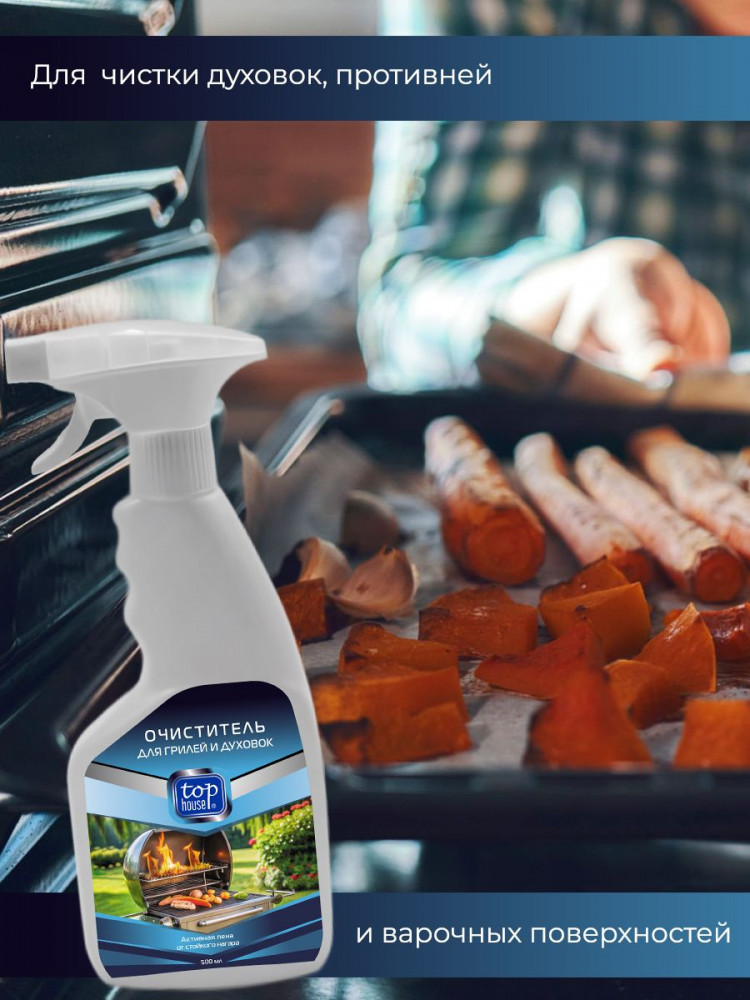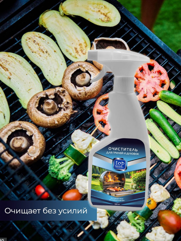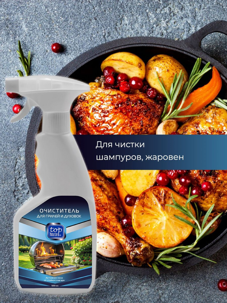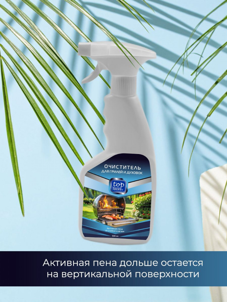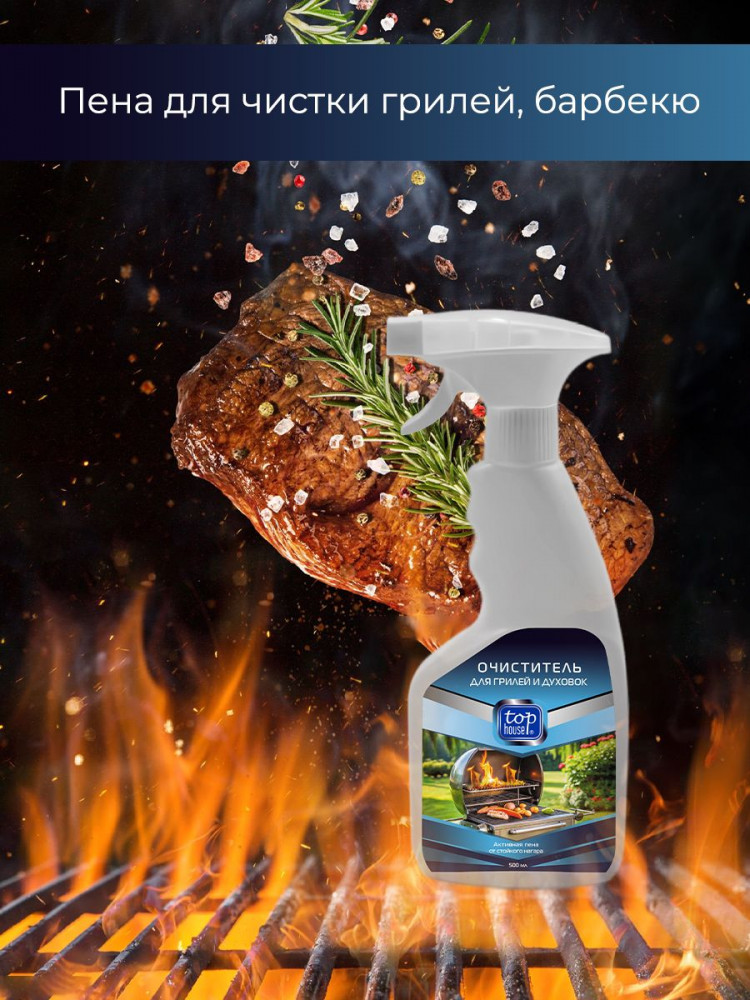 Очиститель гриля, духовок и барбекю Top House — мощное удаление жира, нагара и копоти. Борется с самыми стойкими загрязнениями — легко очищает застывший жир, нагар и копоть с грилей, барбекю, духовок, противней, шампуров и варочных поверхностей. Высокощелочная формула быстро растворяет даже сложные загрязнения без царапин. Активная пена дольше держится на вертикальных поверхностях, усиливая очищающий эффект. Быстро. Эффективно. Без царапин.