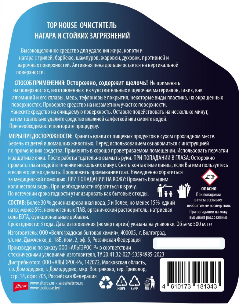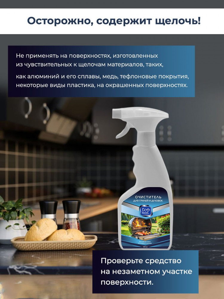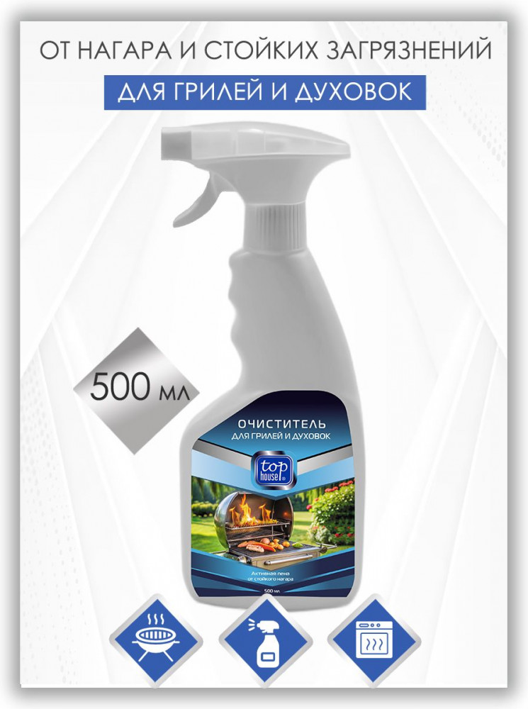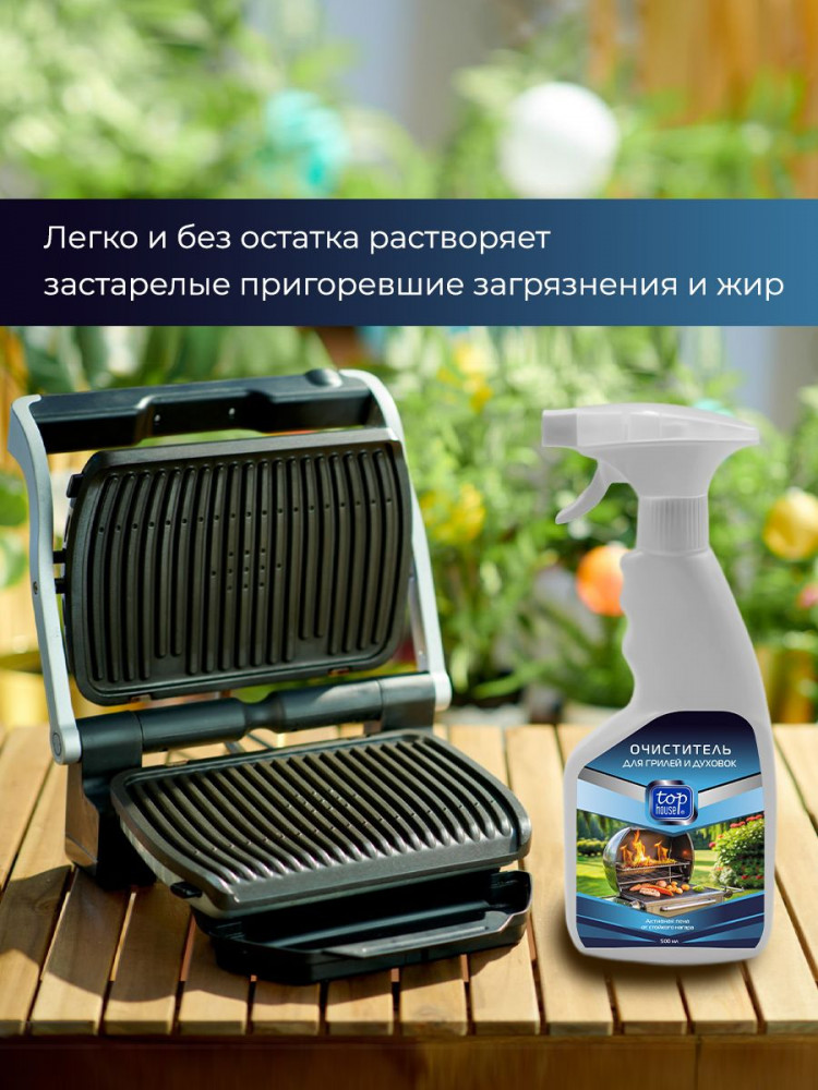 Очиститель гриля, духовок и барбекю Top House — мощное удаление жира, нагара и копоти. Борется с самыми стойкими загрязнениями — легко очищает застывший жир, нагар и копоть с грилей, барбекю, духовок, противней, шампуров и варочных поверхностей. Высокощелочная формула быстро растворяет даже сложные загрязнения без царапин. Активная пена дольше держится на вертикальных поверхностях, усиливая очищающий эффект. Быстро. Эффективно. Без царапин.