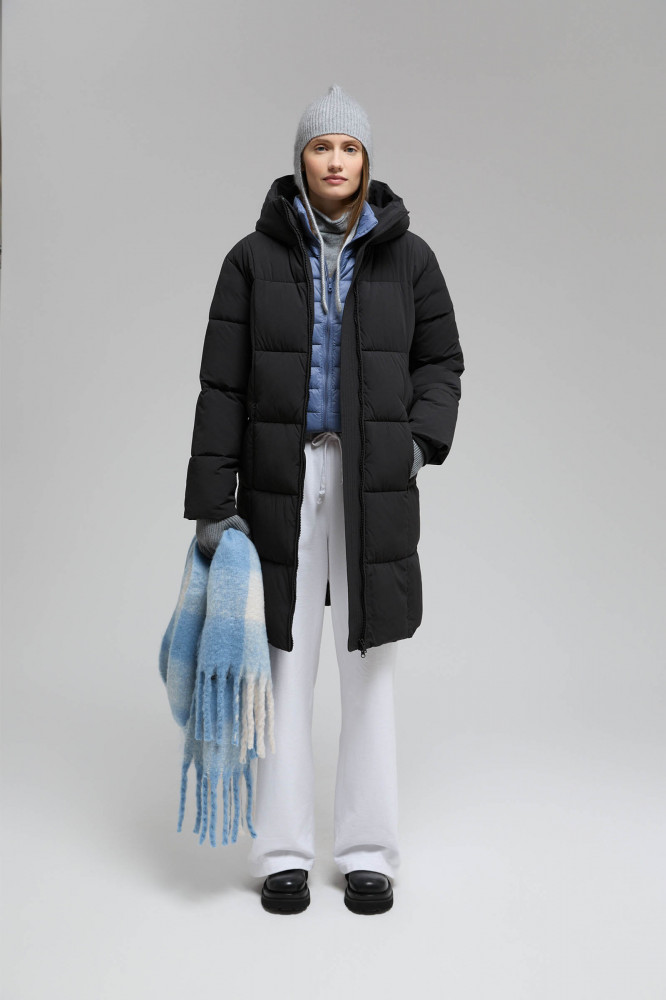 Стеганое пальто с капюшоном надежно защитит от морозов в холодное время года. Модель выполнена из технологичной ткани, которая, благодаря специальным пропиткам, защищает от мокрого снега, дождя и ветра, при этом пропускает воздух и позволяет телу дышать. Ткань устойчива к загрязнениям и отличается износостойкостью.