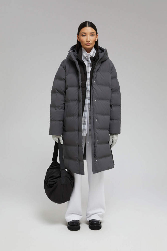 Стеганое пальто с утеплителем из натурального пуха надежно защитит от морозов в холодное время года. Модель выполнена из мембранной ткани, которая благодаря специальным пропиткам защищает от мокрого снега, дождя и ветра, при этом пропускает воздух и позволяет телу дышать. Ткань устойчива к загрязнениям и отличается износостойкостью. Натуральный утиный пух отлично согревает даже в самый сильный мороз, легок и создает внутри изделия комфортный микроклимат. Благодаря полимерному покрытию пухпакета утеплитель не мигрирует через ткань.