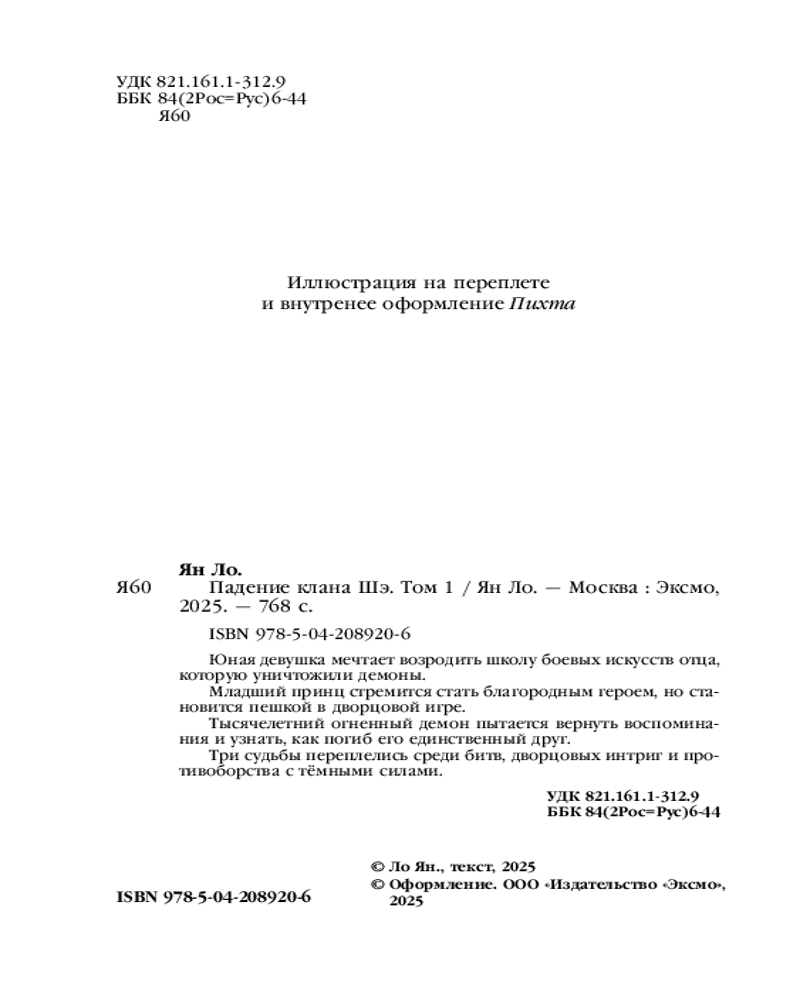 💳 Оплатить за товар можно при получении 🇰🇿 Есть бесплатная доставка по Казахстану 🎁 Копите бонусы с каждой покупки Серия: Тени Поднебесной Клан Шэ, некогда могущественный и уважаемый, переживает упадок после гибели своего главы от рук Агатового владыки. Когда демоны похищают клановую реликвию Зеркало глубин, младшая дочь семьи Шэ решает действовать и отправляется в опасное путешествие в логово демонов, чтобы вернуть украденное. Её путь пересекается с загадочным воином Быстрым Ветром и демоном Хуань Фэнбао, чьи истинные мотивы остаются скрытыми. Вместе они оказываются втянутыми в борьбу за власть, месть и возрождение былого величия клана Шэ. Первый том открывает эпическое повествование, полное интриг, битв и мистических загадок, которое увлечёт любителей восточного фэнтези и приключений. |