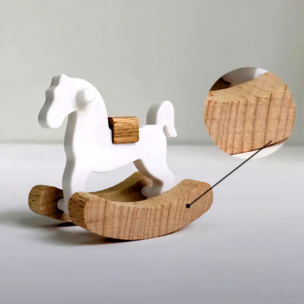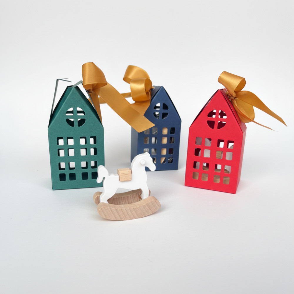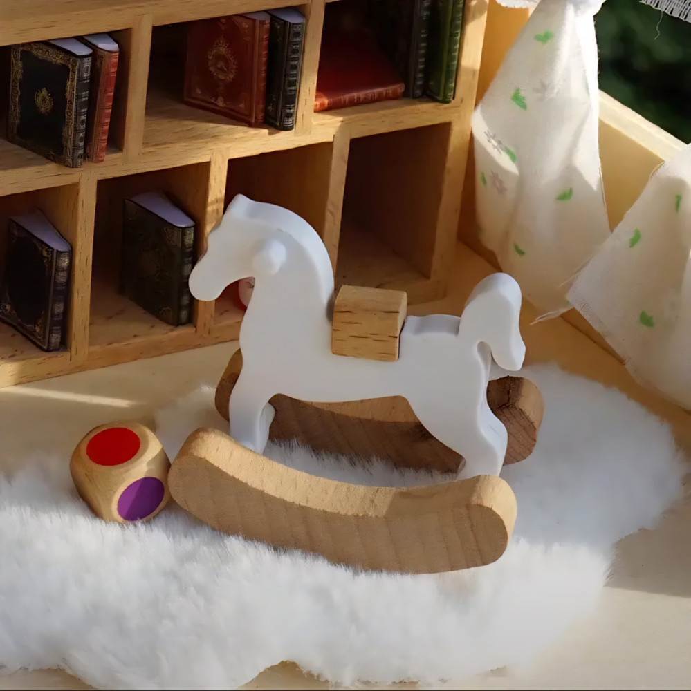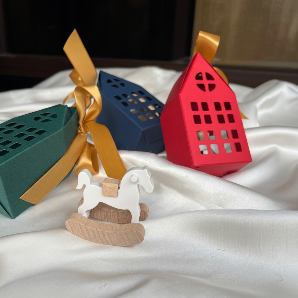 Миниатюрная белая лошадка-качалка в коробочке в виде домика — идеальный маленький подарочек для детей и взрослых.