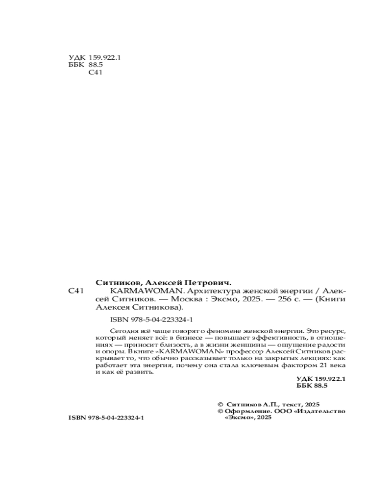 💳 Оплатить за товар можно при получении 🇰🇿 Есть бесплатная доставка по Казахстану 🎁 Копите бонусы с каждой покупки Серия: Книги Алексея Ситникова Сегодня всё чаще говорят о феномене женской энергии. Это ресурс, который меняет всё: в бизнесе повышает эффективность, в отношениях приносит близость, а в жизни женщины — ощущение радости и опоры. В книге «Karmawoman» профессор Алексей Ситников раскрывает то, что обычно рассказывает только на закрытых лекциях: как работает эта энергия, почему она стала ключевым фактором 21 века и как ее развить. |