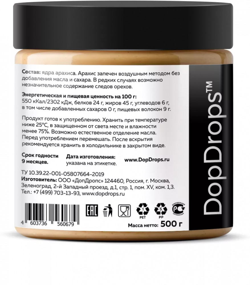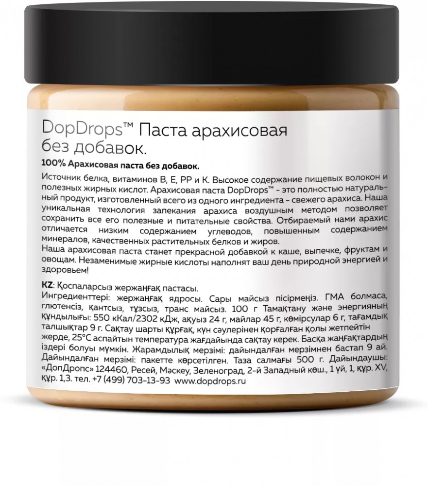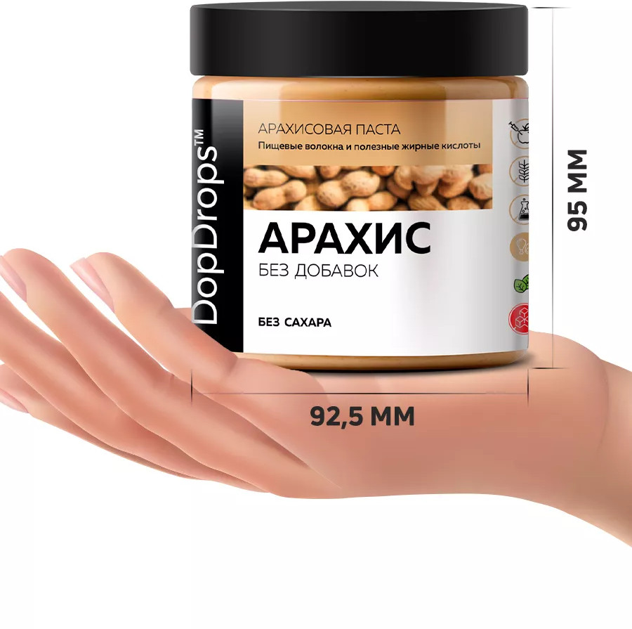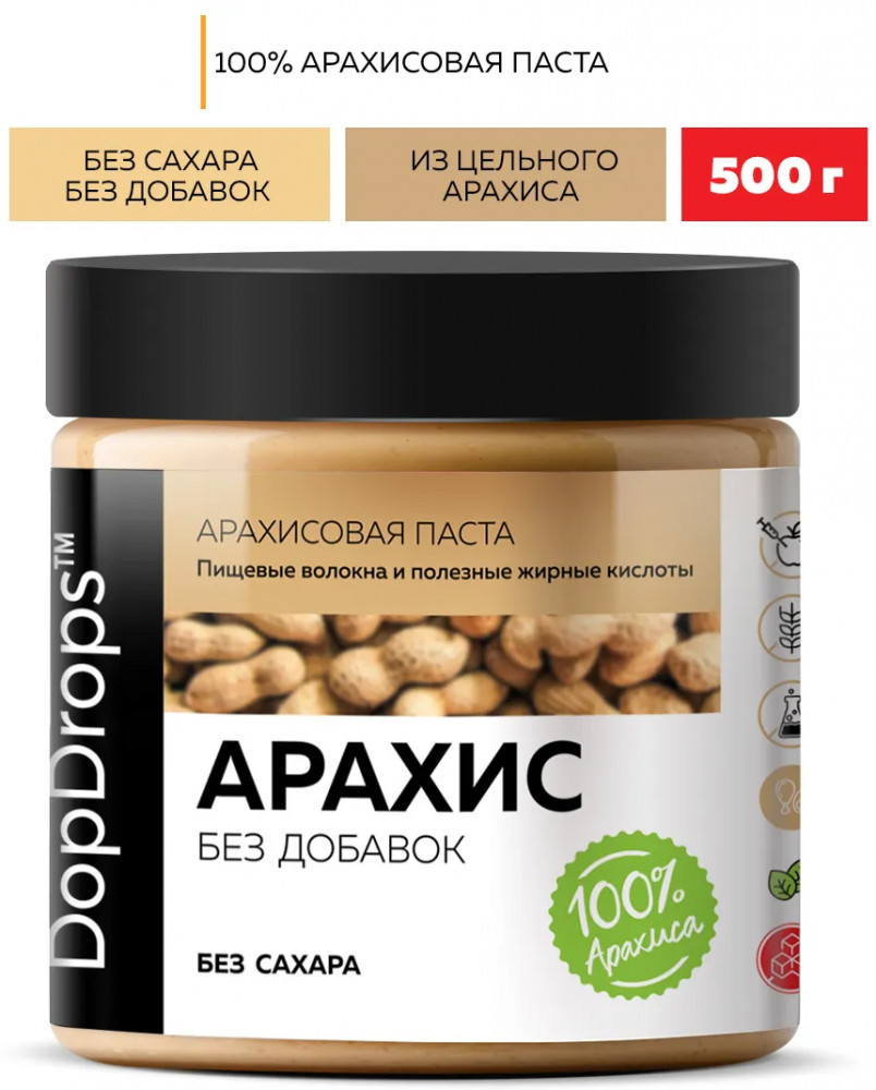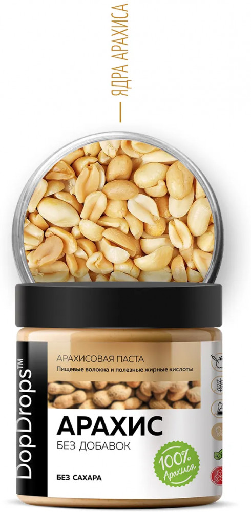Арахисовая паста DopDrops — это не только вкусный, но и полезный продукт с огромным количеством витаминов и необходимых микроэлементов. Паста из арахиса без сахара станет незаменимым дополнением к вашему правильному питанию, а также прекрасным угощением для всей семьи. Термическая обработка ореха, помол и фасовка — все это делаем сами. 30 минут от ореха до банки на собственном производстве. Мы не используем отходы, лом и дешевое сырье: только цельный сортовой арахис, специально отобранного премиум сорта. Тщательно контролируем качество на входе, запекаем в воздушной печи, без обжарки и гарантированно избегаем образования канцерогенов при термообработке. Только так арахис сохраняет все свои полезные природные свойства. Арахис жареный проигрывает по вкусу и пользе запеченному.