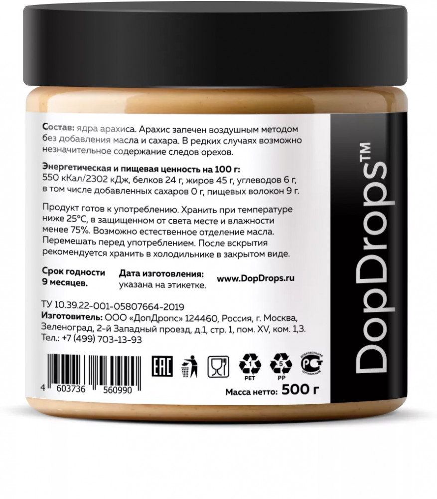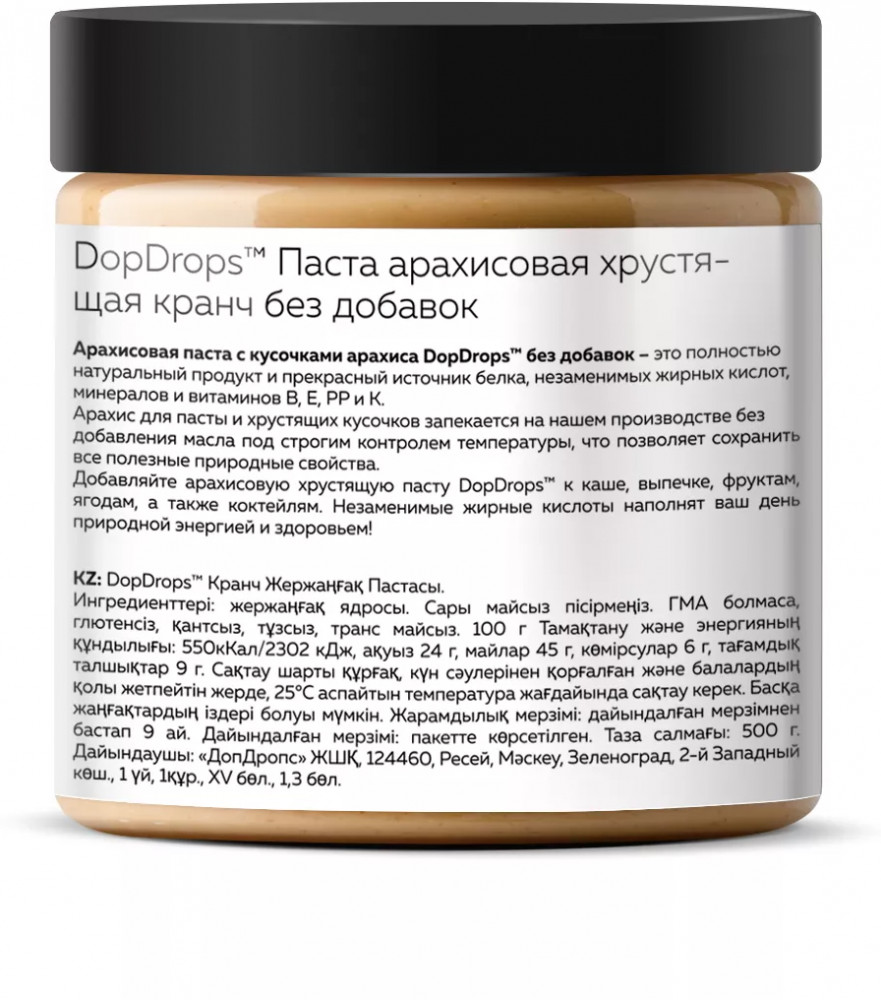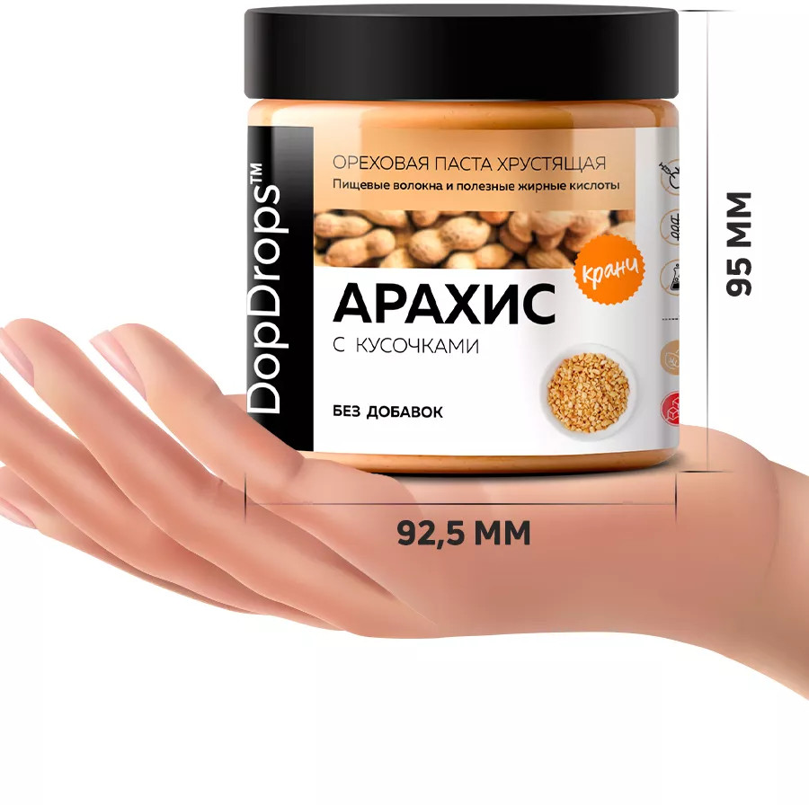 Арахисовая паста с хрустящими кусочками DopDrops — это не только вкусный, но и полезный продукт с огромным количеством витаминов и необходимых микроэлементов. Паста кранч из арахиса без сахара станет незаменимым дополнением к вашему правильному питанию, а также прекрасным угощением для всей семьи. Термическая обработка ореха, помол и фасовка — все это делаем сами. 30 минут от ореха до банки на собственном производстве. Мы не используем отходы, лом и дешевое сырье: только цельный сортовой арахис, специально отобранного премиум сорта. Тщательно контролируем качество на входе, запекаем в воздушной печи, без обжарки и гарантированно избегаем образования канцерогенов при термообработке. Только так арахис сохраняет все свои полезные природные свойства. Арахис жареный проигрывает по вкусу и пользе запеченному.
