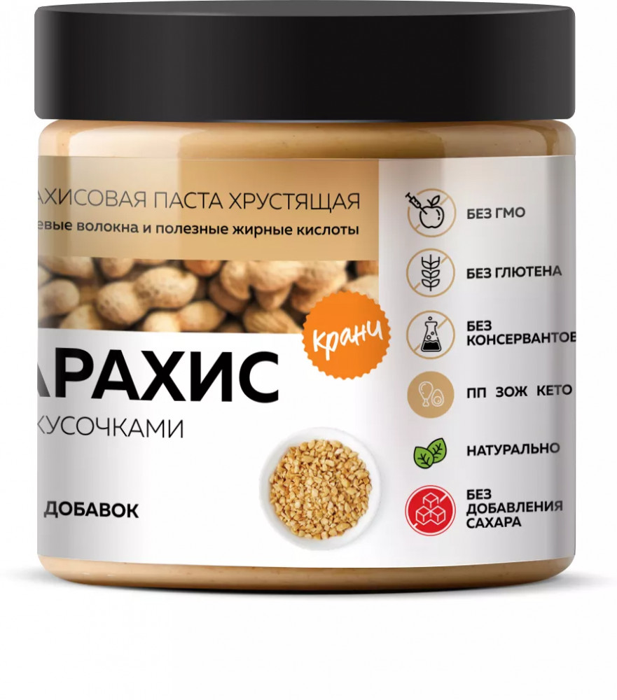 Хрустящие кусочки арахиса мы изготавливаем по собственной технологии: они такие же свежие, как и паста! Дробленый орех добавляет уникальный хруст и текстуру пасте. Наш арахис без ГМО и отличается низким содержанием углеводов и повышенным содержанием минералов, качественных растительных белков и незаменимых жирных кислот. А уникально низкий гликемический индекс и высокое содержание натуральных пищевых волокон делает ореховую пасту по-настоящему диетическим продуктом, который подходит для веган и кето диеты, зож, пп. Можно в пост. Кето-продукт обладает множеством полезных свойств: укрепляет структуру волос и ногтей, помогает набрать мышечную массу, улучшает гормональный фон и является натуральным антидепрессантом. Протеиновая паста подходит не только спортсменам для набора мышечной массы, но и диабетикам, которые хотят контролировать уровень сахара в крови. Арахисовая паста без добавок также подходит для веганов, так как не содержит глютена и лактозы.