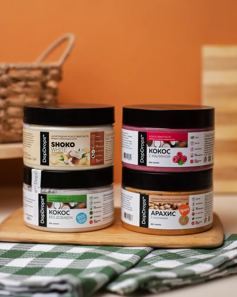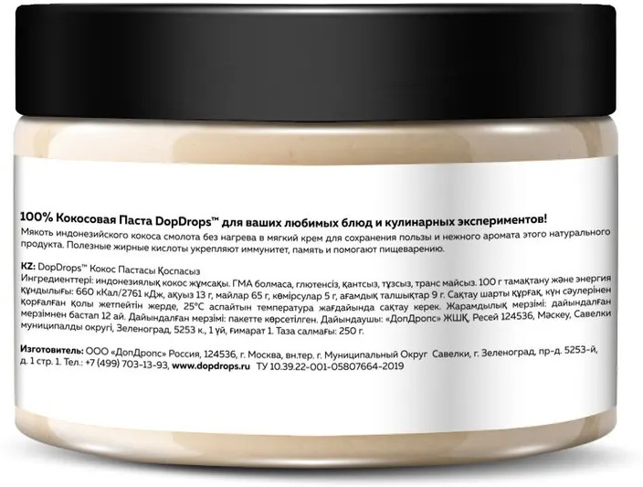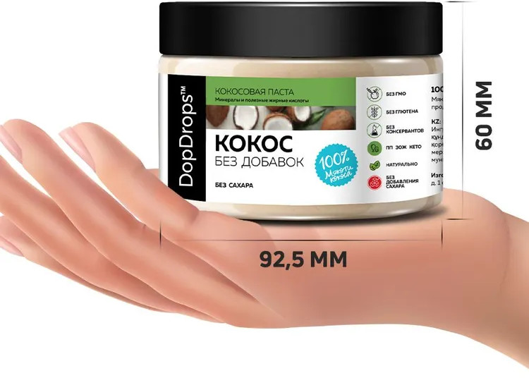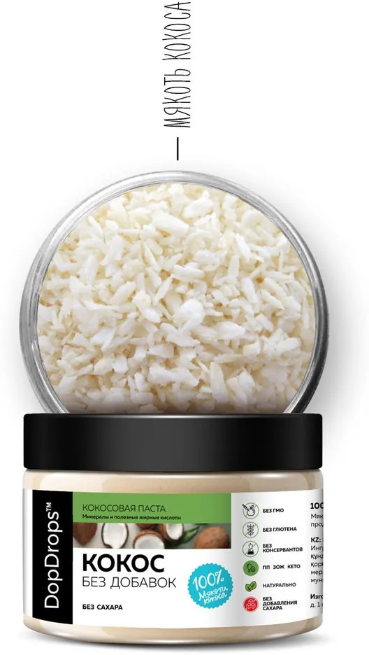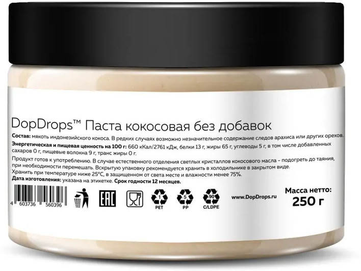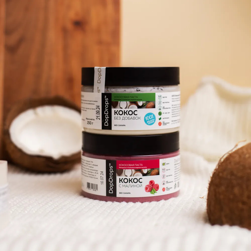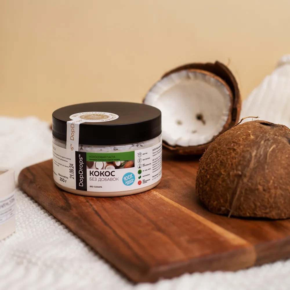 Кокосовая паста DopDrops — это 100% натуральный продукт без сахара с ярким вкусом и утонченным ароматом. Мякоть индонезийского кокоса смолота без нагрева в мягкий крем, чтобы вы получили максимум вкуса и пользы от этого изысканного десерта. Кокос выращивается на берегах Индийского океана и богат морскими минералами натуральными, необходимыми для поддержания здоровья нашего организма. Полезные жирные кислоты укрепляют иммунитет, память и помогают пищеварению. Кокосовый крем изготовлен из дегидратированной мякоти кокоса без сахара максимальной жирности — 65 гр. на 100 гр. продукта. Мы очень серьезно относимся к выбору сырья и выбираем только качественное. Специально используем только самый жирный кокос, который стоит дороже.