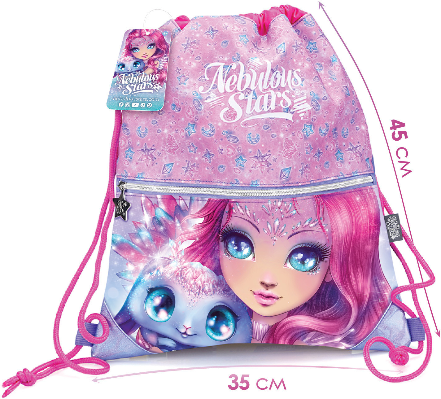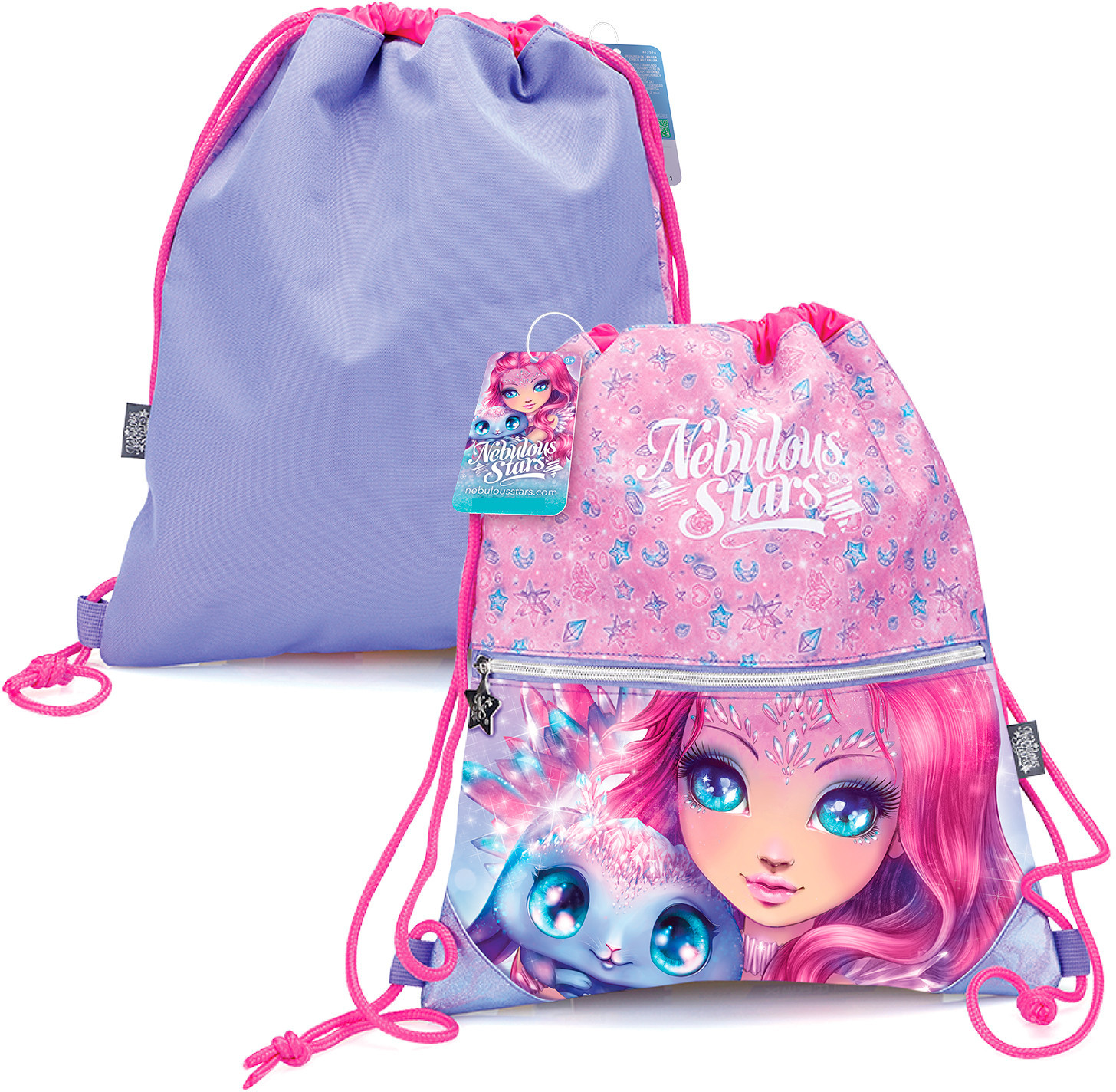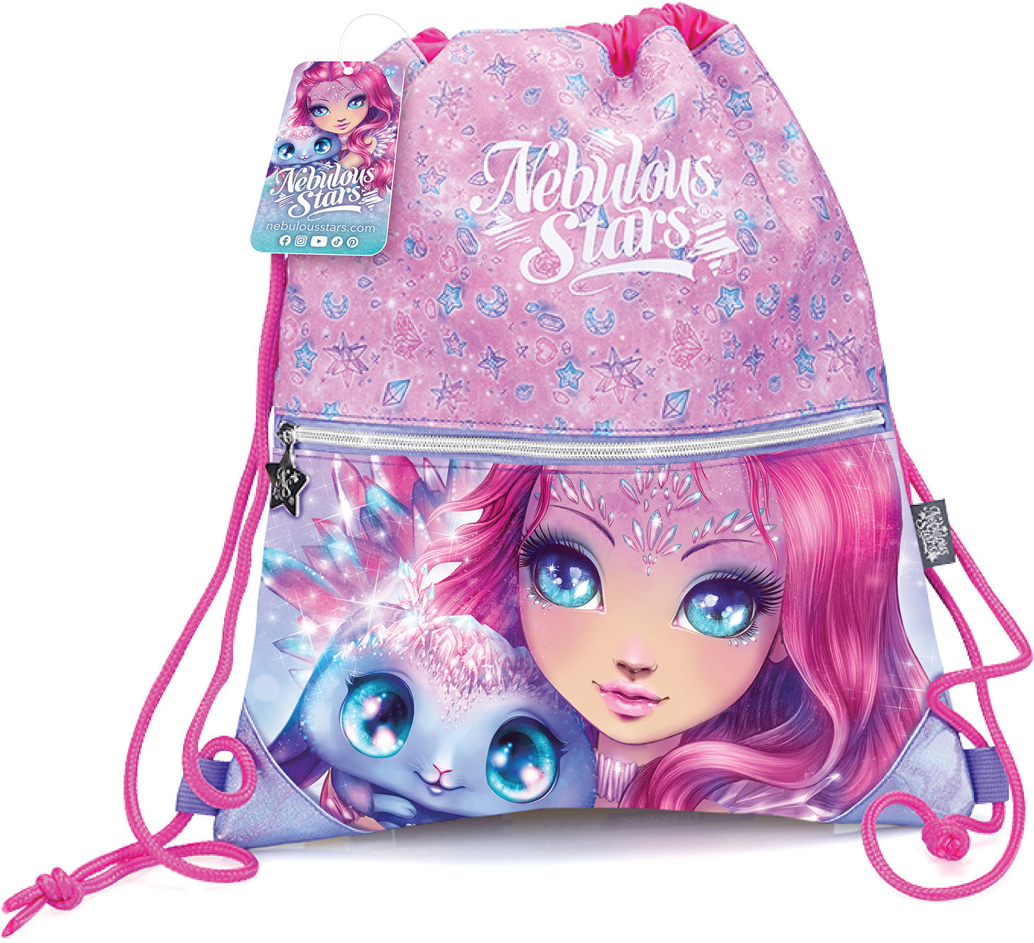 Лёгкая сумка-мешок от звёздочки Кристалии с передним карманом на молнии. Прекрасное дополнение к школьному рюкзаку или пеналу с принтами на тему Мерцающей Туманности Nebulous. В неё можно поместить сменную обувь или спортивную форму. Сумка оснащена удобными лямками из шнура, которые надёжно затягиваются сверху, предотвращая раскрытие сумки во время ношения.
