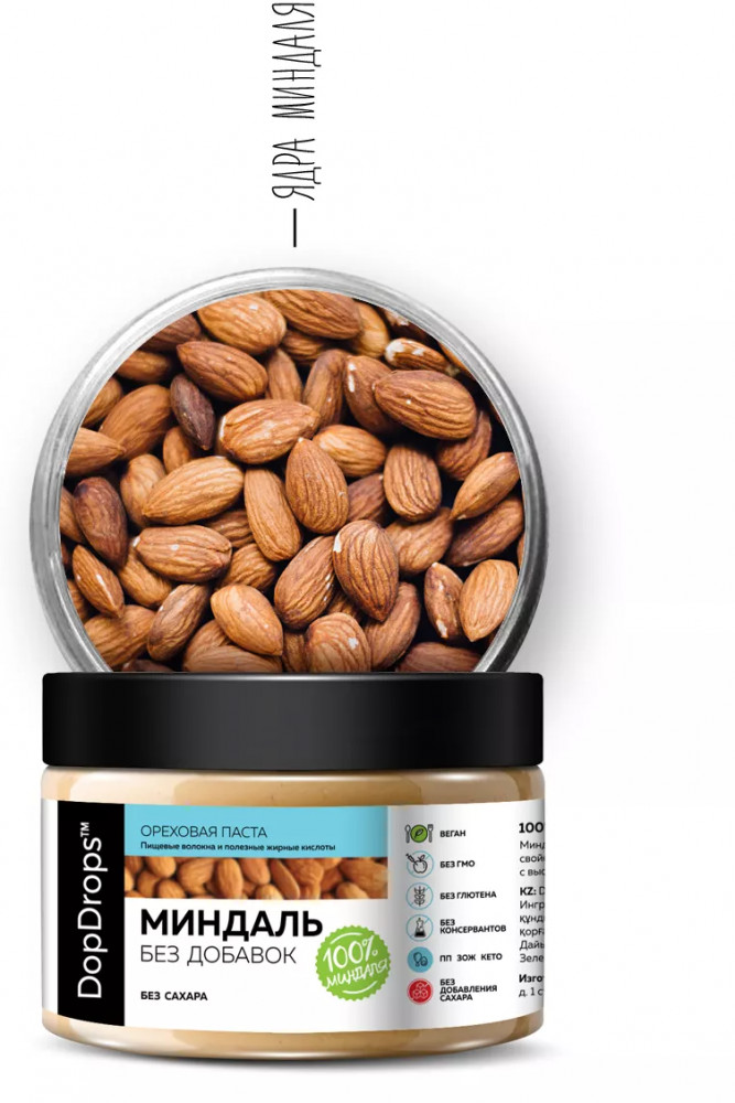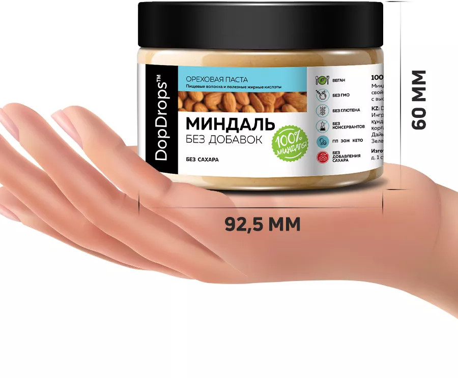 Для ореховой пасты без сахара мы используем фирменный помол доп дропс — крупинки с равномерным распределением. Такой помол, на наш вкус, лучше всего для натуральной ореховой пасты из хорошего миндаля. Позволяет чувствовать весь диапазон вкуса и обеспечивает оптимальную структуру. Паста миндаль богата пищевыми волокнами, жирными кислотами, витаминами группы B, C, E, K и минералами. Без сахара, без глютена и без ГМО, натуральная миндальная паста идеально подходит тех кто на кето, вегетарианцев, веганов и диабетиков, можно в пост. Благодаря своим питательным свойствам, миндальный урбеч хорошо насыщает, блокирует потребность в постоянных перекусах и тем самым способствуют похудению и поддержанию фигуры. Ореховая паста миндаль поможет вам не только сохранить форму, но и получить дополнительную энергию для тренировок.