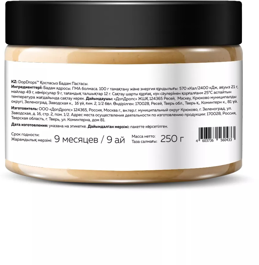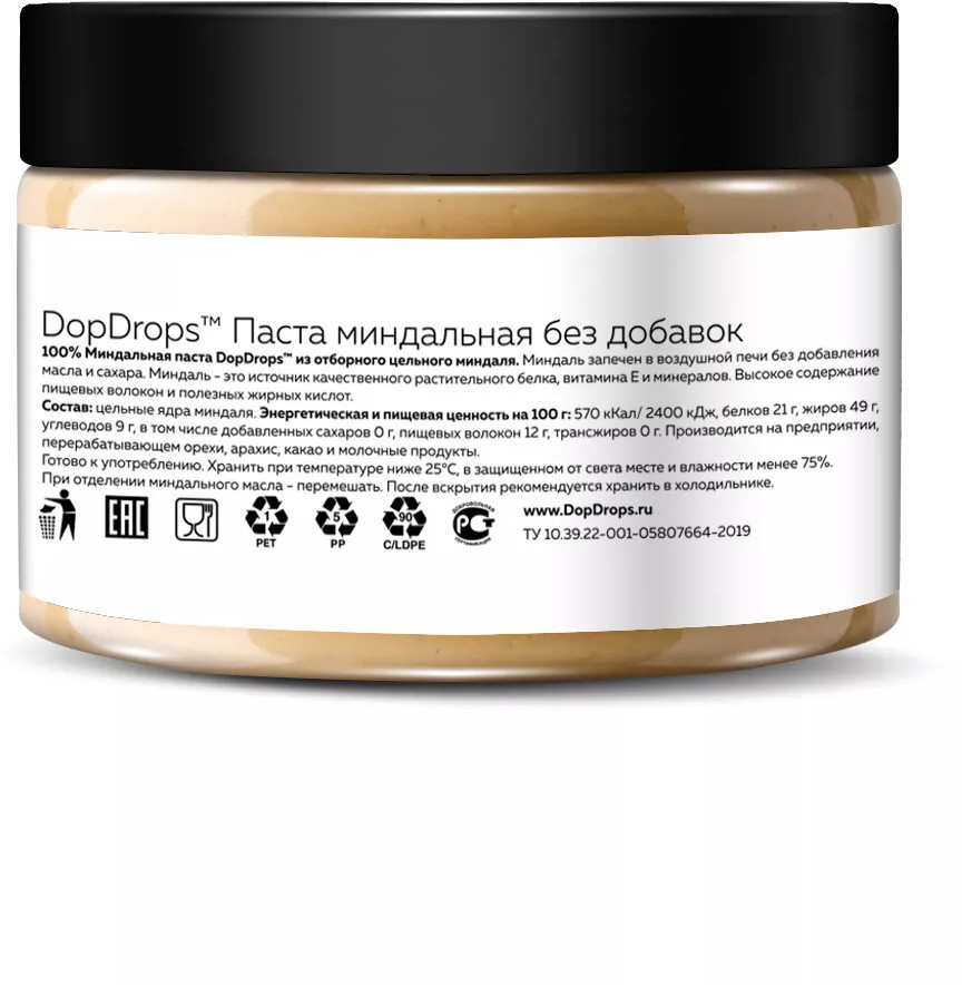 Миндальная паста DopDrops с высоким содержанием пищевых волокон и полезных жирных кислот, поможет вам сохранить здоровье на долгие годы. Паста без сахара настоящее лакомство с безупречным вкусом и ароматом, которое станет отличным дополнением ежедневного рациона как для любителей спортивного образа жизни, так и для тех, кто следит за своим питанием в рамках ПП и ЗОЖ. Мы запекаем орех на своем производстве с контролем температуры. Диапазон температур, при котором миндаль приобретает характерный вкус, но при этом масла, входящие в его состав, не достигают температуры дымления, очень узок. Наш технологический процесс построен так, что мы гарантированно избегаем образования канцерогенов при термообработке.