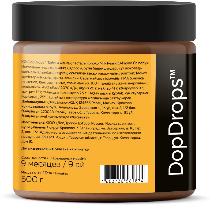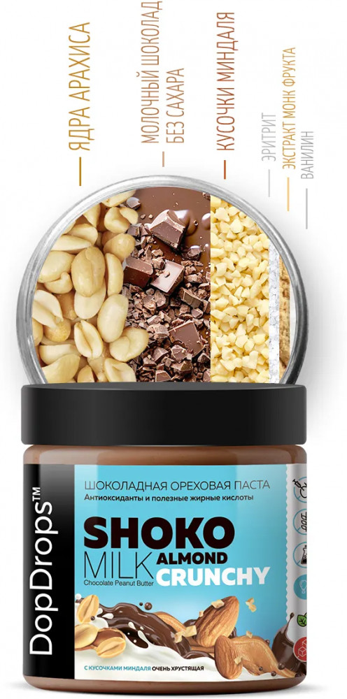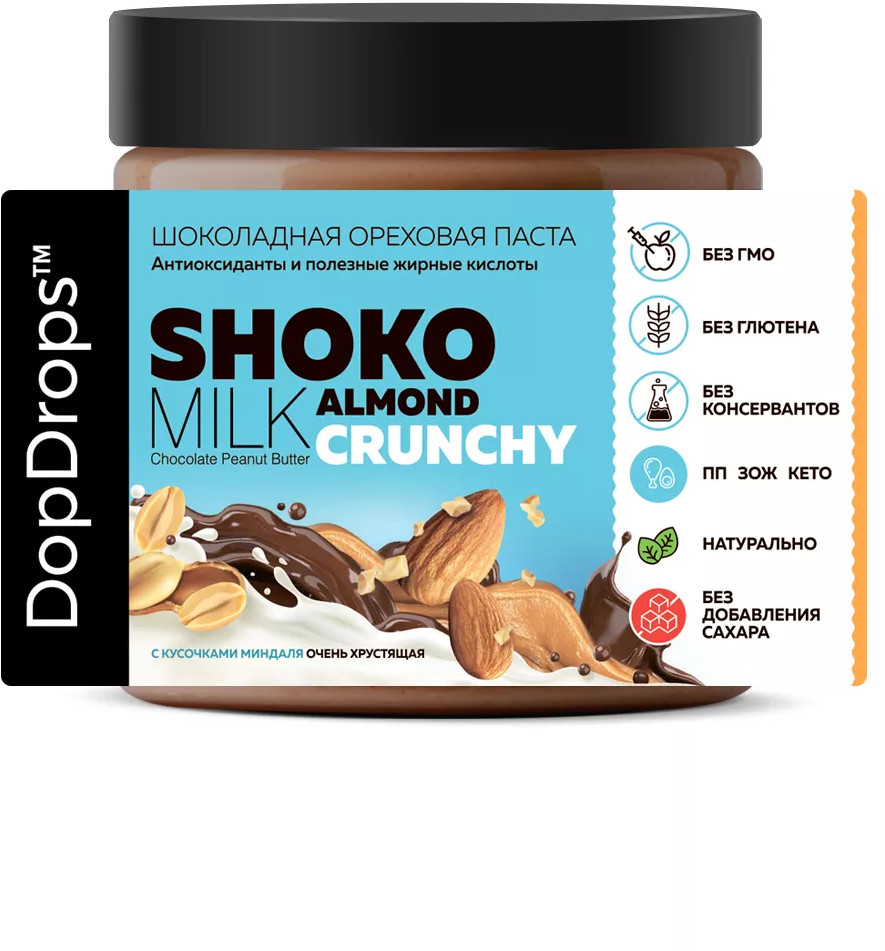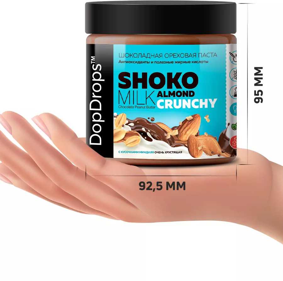 Паста шоко милк без глютена и без ГМО, является ценным источником антиоксидантов и полезных жирных кислот, поэтому идеальна как для людей на традиционном питании, так и для тех кто на кето, вегетарианцев и диабетиков. За счет богатого состава, шоколадно-арахисовая паста с кусочками миндаля питательна и хорошо насыщает, что подходит для ПП питания и поможет контролировать вес. Наслаждайтесь этим неповторимым пп десертом без сахара не только сами, но и дарите его своим близким. Комбинация хрустящей структуры и бархатистой консистенции пасты шоко милк, сочетающаяся с нежной сладостью, делает это лакомство поистине выдающимся. Пасты DopDrops — вкусные и полезные пп продукты для тех, кто ценит качество и следит за своим здоровьем.