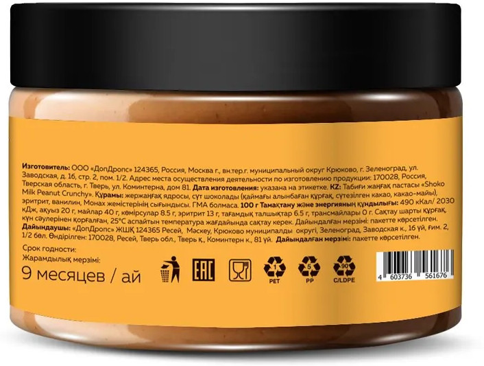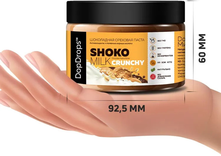 Натуральная шоколадно-арахисовая паста кранч DopDrops Shoko Milk Peanut Crunchy отличный десерт и полезный продукт для всей семьи, который зарядит энергией на целый день. Диетическая паста — это шоколадное наслаждение, сочетающее в себе нежность арахисовой пасты и хрустящую текстуру кусочков арахиса. Пасты шоколадные от доп дропс изготавливаются по классической технологии. Арахис бережно запекается воздушным методом с контролем температуры без добавок и масла. Тщательно отобранные ингредиенты перетираются в каменной мельнице до нежнейшей консистенции. Этот длительный процесс занимает до 48 часов, что позволяет раскрыть естественный и чистый вкус шоколада и орехов. А чтобы добиться неповторимой текстуры, очищенный арахис дробится в хрустящие кусочки.