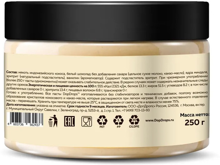 Пасты шоколадные от доп дропс изготавливаются по классической технологии. Мякоть индонезийского кокоса смолота без нагрева в мягкий крем для сохранения пользы и нежного аромата этого натурального продукта. Этот длительный процесс занимает до 48 часов и позволяет раскрыть естественный и чистый вкус шоколада и кокоса. Для максимальной пользы и вкуса, мы используем кокос максимальной жирности, специально отобранного премиум сорта. А чтобы добиться неповторимой текстуры, очищенный миндаль дробится в хрустящие кусочки. Шоколадные пасты DopDrops Shoko White — это 100% натуральные низкоуглеводные пасты без сахара с высоким содержанием белка. В качестве подсластителя используем натуральный сахарозаменитель эритритол. Эритрит имеет нулевую калорийность, не поднимает уровень сахара в крови и абсолютно безопасен. В каждой ложке потрясающий вкус настоящего белого шоколада без сахара, который поднимет настроение, а также придаст сил и энергии! ПП паста без глютена и ГМО является ценным источником антиоксидантов и полезных жирных кислот, поэтому идеальна как для людей на традиционном питании, так и для тех кто на кето, вегетарианцев и диабетиков. За счет богатого состава, хрустящая кокосовая паста с белым шоколадом без сахара хорошо насыщает, что подходит для здорового питания и поможет контролировать вес. Мы убедительно рекомендуем этот низкоуглеводный продукт как альтернативу обычным сладостям.