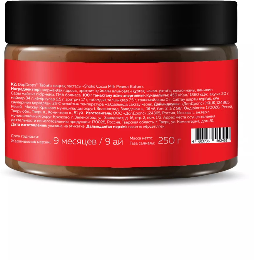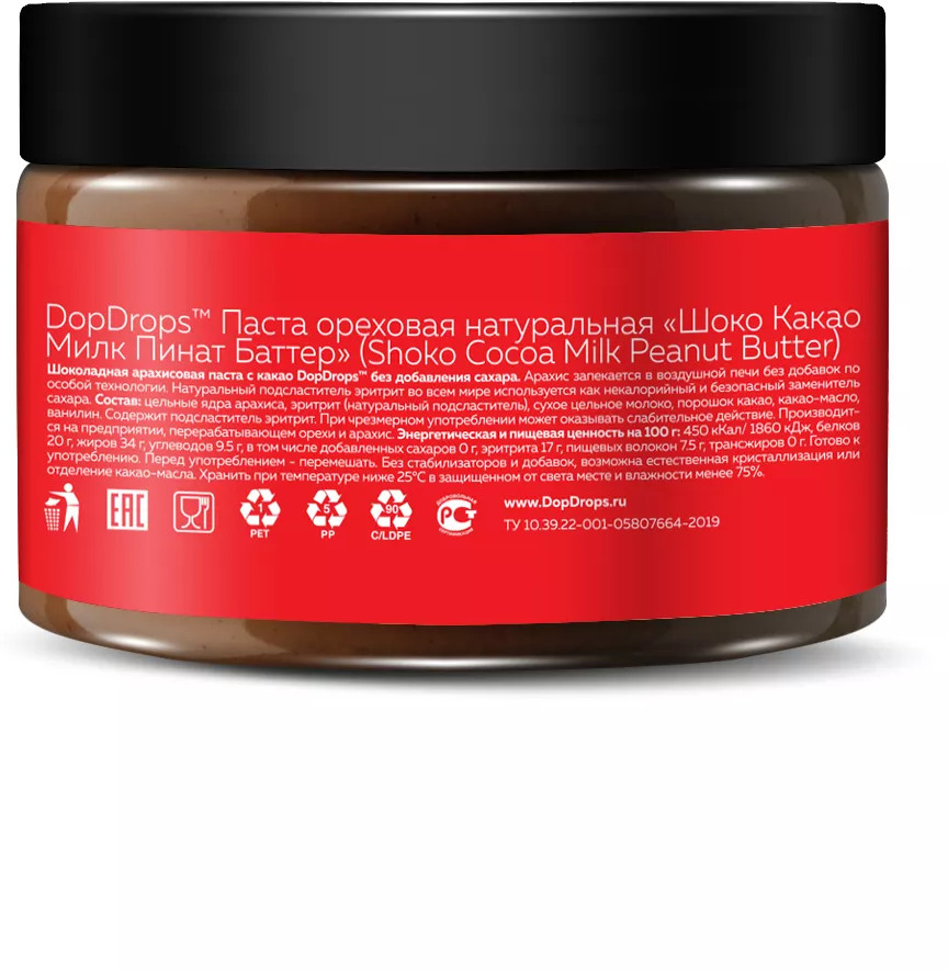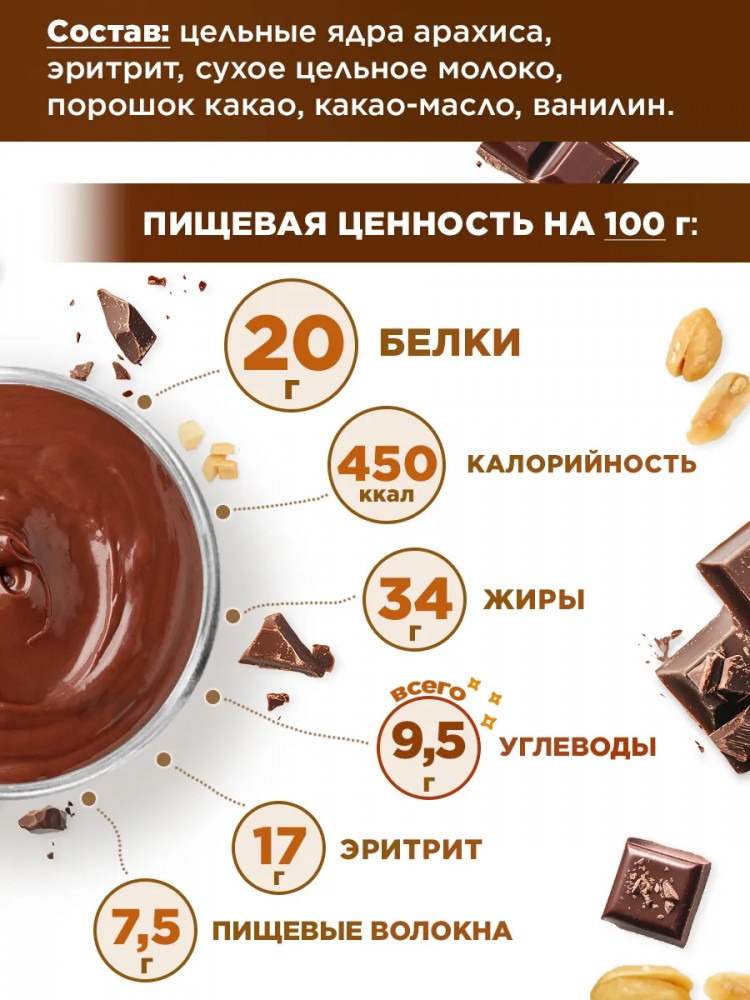Пасты шоколадные от доп дропс изготавливаются по классической технологии. Арахис бережно запекается воздушным методом с контролем температуры без добавок и масла. Тщательно отобранные ингредиенты перетираются в каменной мельнице до нежнейшей консистенции. Этот длительный процесс занимает до 48 часов, что позволяет раскрыть естественный и чистый вкус шоколада и орехов. В качестве подсластителя используем натуральный сахарозаменитель эритритол. Эритрит имеет нулевую калорийность, не поднимает уровень сахара в крови и абсолютно безопасен. В каждой ложке потрясающий вкус настоящего шоколада без сахара, который поднимет настроение, а также придаст сил и энергии! Паста шоко без глютена и ГМО является ценным источником антиоксидантов и полезных жирных кислот, поэтому идеальна как для людей на традиционном питании, так и для тех кто на кето, вегетарианцев и диабетиков. За счет богатого состава, шоколадная паста без сахара хорошо насыщает, что подходит для здорового питания и поможет контролировать вес. Мы убедительно рекомендуем этот низкоуглеводный продукт как альтернативу обычным сладостям.
