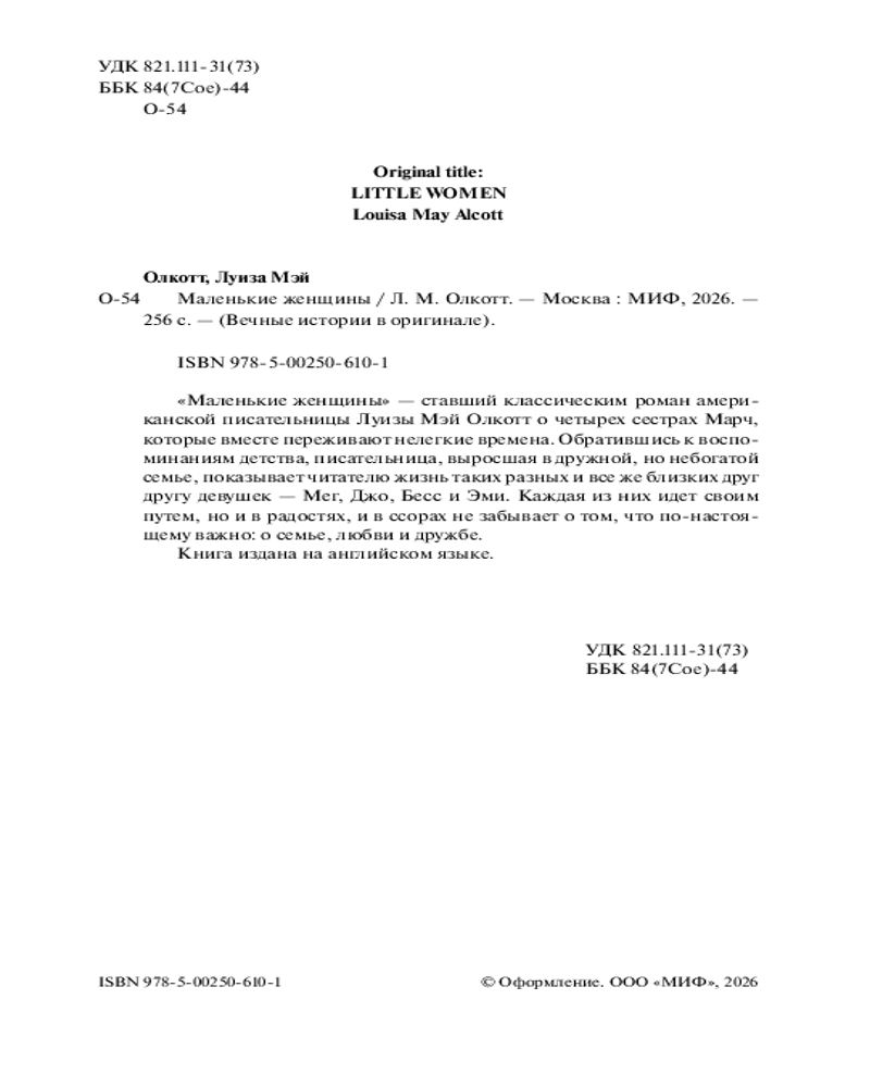 💳 Оплатить за товар можно при получении 🇰🇿 Есть бесплатная доставка по Казахстану 🎁 Копите бонусы с каждой покупки Серия: Вечные истории в оригинале «Маленькие женщины» — ставший классическим роман американской писательницы Луизы Мэй Олкотт, изданный в оригинале на английском языке. |