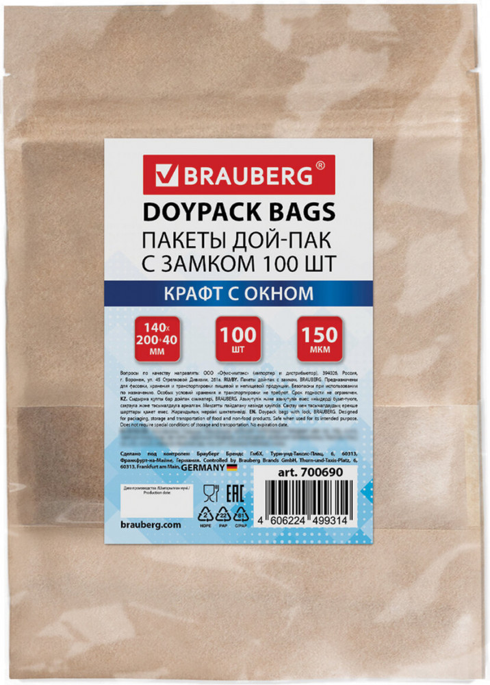 💳 Оплатить за товар можно при получении 🇰🇿 Есть бесплатная доставка по Казахстану 🎁 Копите бонусы с каждой покупки Пакеты Дой-Пак BRAUBERG это современное решение для хранения и транспортировки разных продуктов. Благодаря устойчивому дну, герметичной застежке и компактному дизайну, они сочетают удобство использования, сохранение свежести и привлекательный внешний вид. Пакеты Дой-Пак BRAUBERG — современный формат упаковки, идеально подходящий для хранения и транспортировки самых разных продуктов: крупы, орехи, сладости, чай, кофе и пр. Пакеты Дой-Пак имеют эргономичный дизайн и занимают минимум места. Застежка ZIP LOCK позволяет герметично закрыть пакет и защитить содержимое от влаги, воздуха и загрязнений. Пакет выполнен снаружи выполнен из крафт бумаги, внутри из прозрачного полиэтилена, имеет окошко 50×140 мм для идентификации содержимого пакета. Оцените преимущество пакетов Дой-Пак BRAUBERG и сделайте ваш продукт удобнее, практичнее и привлекательнее. |