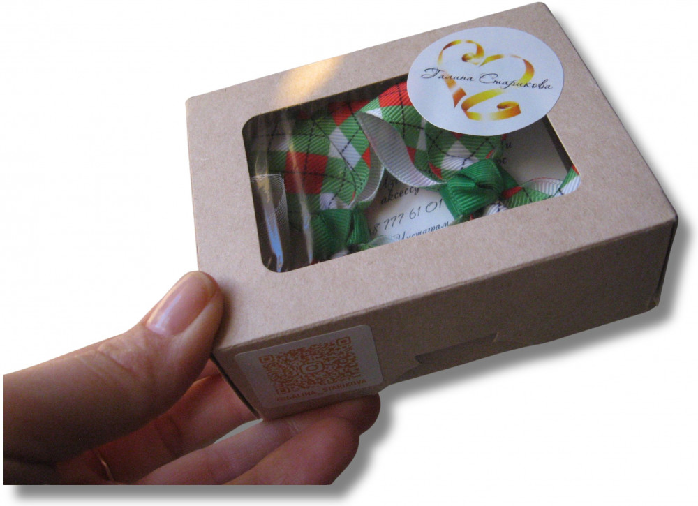 В наборе бантики — 2 шт, упаковка — крафт-коробочка.