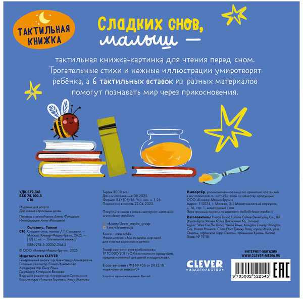 Красивые стихи известной писательницы Елены Фельдман и нежные иллюстрации книги для малышей настроят ребенка на сон, а 6 тактильных вставок помогут познавать мир через прикосновения. Тактильные книги для малышей, познавательные книги Clever позволят ребенку развивать мелкую моторику. А еще эти детские книги, которые выпускает издательство Clever, «трогательные» книги для детей обязательно подарят мальчикам и девочкам сладкие сны.